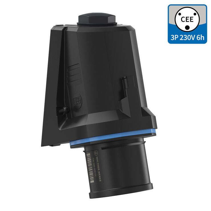 WALTHER CEE NEO Wandgerätestecker schräg mit Käfigzugfeder-Technik 16A 3P 6h IP54 200-250V~ mit Farbringcodierung blau Gehäuse aus PA6-Material mit hoch wärmebeständigem Kontaktträger aus PA66-Material mit einer Kabeleinführung M25 oben zur Innenbefestigung
