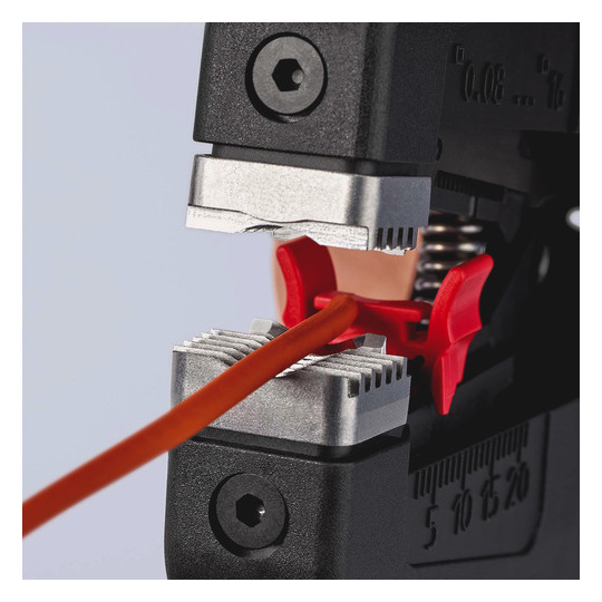 12 52 195 SB KNIPEX PreciStrip16 Einfaches, präzises Abisolieren von feindrähtigen bis massiven Rundkabeln im großen Kapazitätsbereich von 0,08 bis 16 mm² mit nur einer Zange. Guter Grip dank halbrunder Metall-Haltebacken mit Kammprofil. Exakter Schnitt dank parabelförmiger Abisoliermesser. Eine Automatik regelt die Einschneidetiefe der Abisoliermesser. Der Nullpunkt dieser Automatik ist bei besonderen Einsatzbedingungen (Isoliermaterial, Temperatur) in feinen Schritten anpassbar. Optional erhältlich: Messerblock (12 49 32) ausgelegt für sehr harte halogenfreie Kabel von 4 - 16mm². Mit einstellbarem Längenanschlag für präzises, wiederholgenaues Arbeiten. Beschriftungsfeld zur Individualisierung. Komfortable Handhabung durch ergonomischen Zweikomponenten-Griff. Mit Befestigungsöse, geeignet für KNIPEX Tethered Tools-Zubehör. Leicht auswechselbare Messerkassette. Mit obenliegendem Kabelschneider für Cu- und Alu-Leiter feindrähtig bis 16 mm² (AWG 6), eindrähtig bis 6 mm² (AWG 10). - Abisolierwerte Quadratmillimeter: 0,08