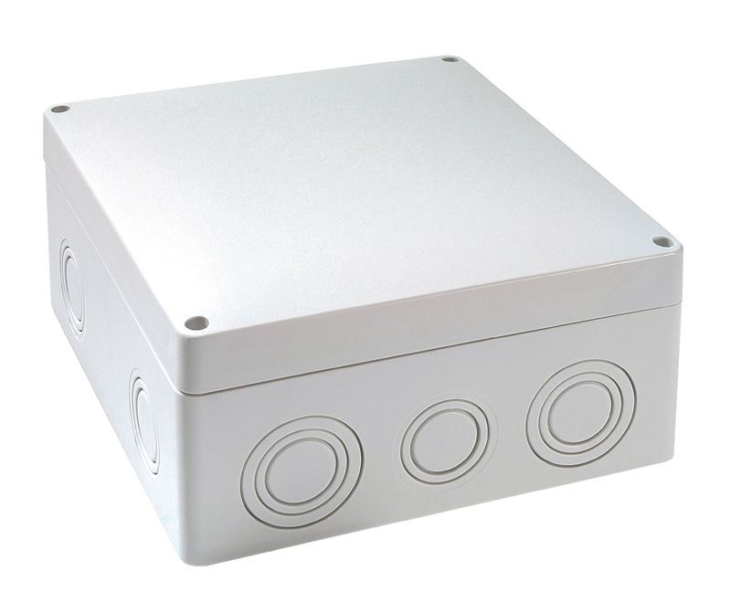 Verbindungsdose, mit Schutzart IP54/IP65, Nennquerschnitt 16qmm, Ui=690V AC, zertifiziert nach VDE (DIN EN 60670-1/-22 (VDE 0606-1/-22)), Ausschlagmembranen, M20/M25/M32/M40, (2 rückseitig, 10 seitlich), innenliegende Befestigungsstellen, für Standardinstallationen im Innenbereich, grau, ohne Klemmen Abmessungen: 180 x 180 x 91mm Beigefügtes Zubehör: 4 Anbaustutzen IP54 M40 Dichtbereich 17-30mm, 1 Verschlussstopfen M40, 1 Plombierset