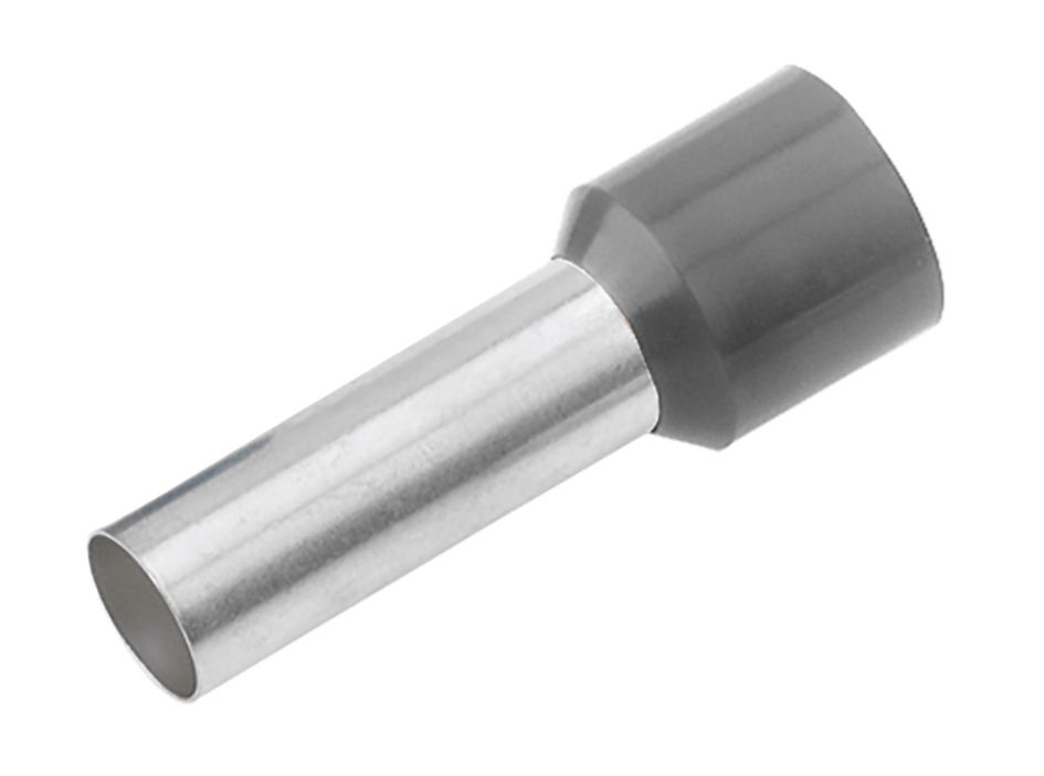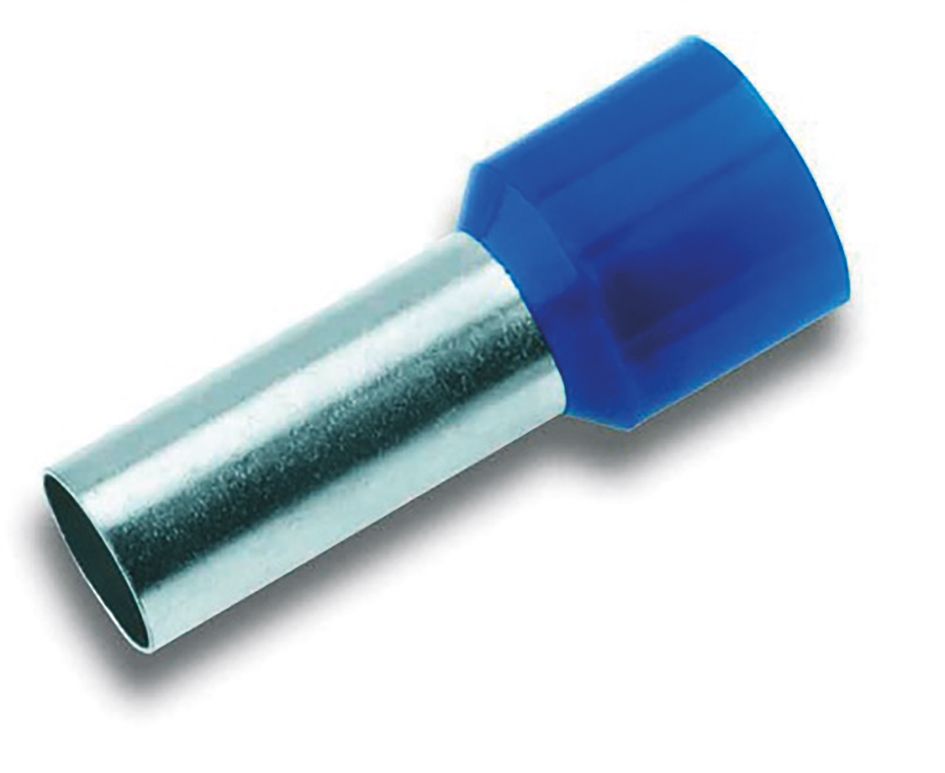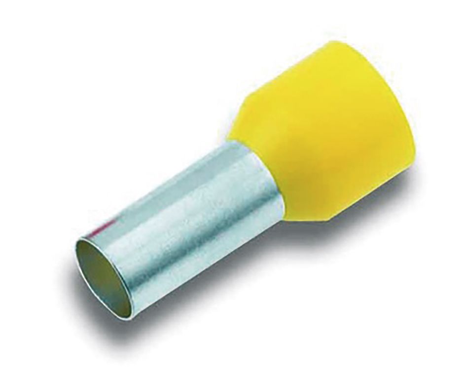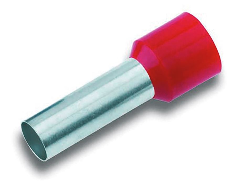 Aderendhülse mit Isolation, DIN-Farbreihe, aus Elektrolyt-Kupfer, Oberfläche galvanisch verzinnt, Einführungstrichter aus Polypropylen, Temperaturbeständig bis 105°C, nach DIN 46228, Teil 4.