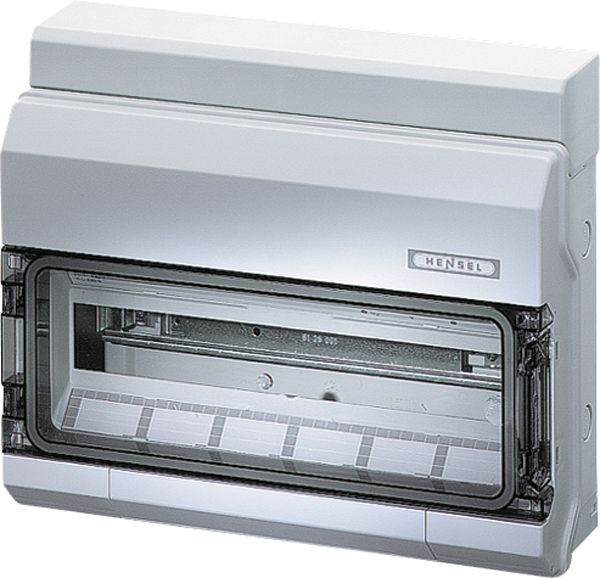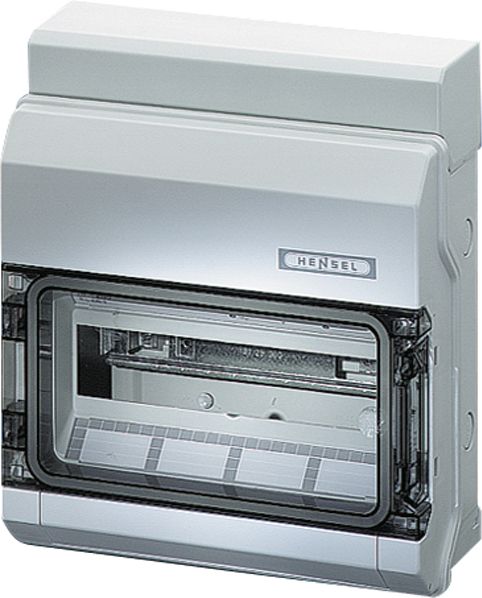Kleinverteiler aus hochwertigem Thermoplast (Polystyrol). Für Aufputz-Anwendungen in Gebäuden oder der geschützten Installation im Freien. Automatengehäuse, mit 12 Teilungseinheiten, zum Einbau von Geräten mit Schnappbefestigung auf DIN-Tragschiene. Kabeleinführung über integrierte elastische Dichtmembranen. Mit transparenter Tür und Kabeleinführungsblende, integriertem Zubehörfach und Abdeckstreifen für den Geräteausschnitt. Schutzart IP 65.