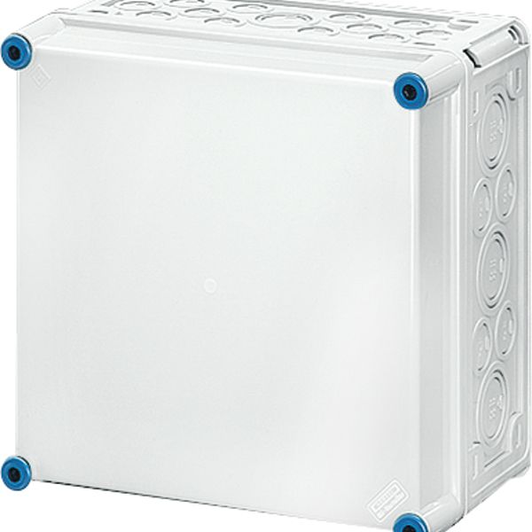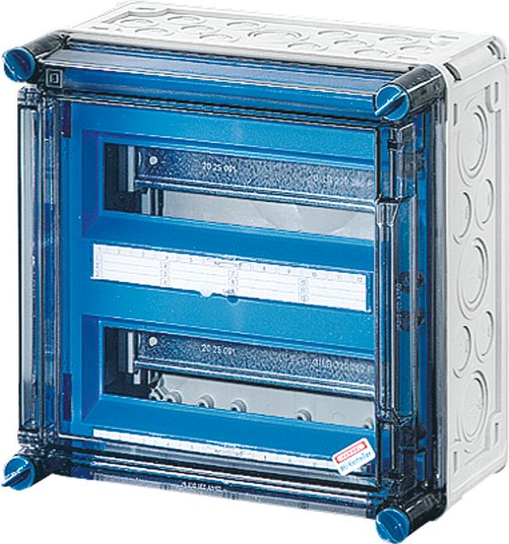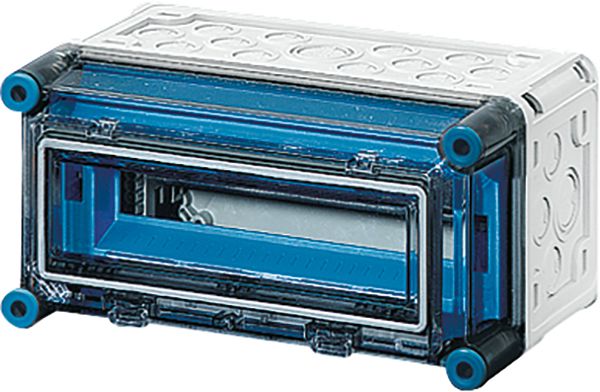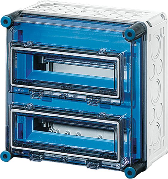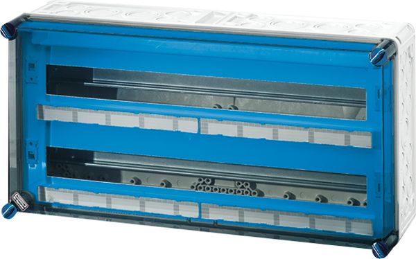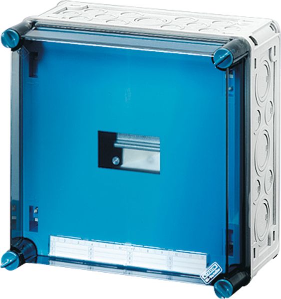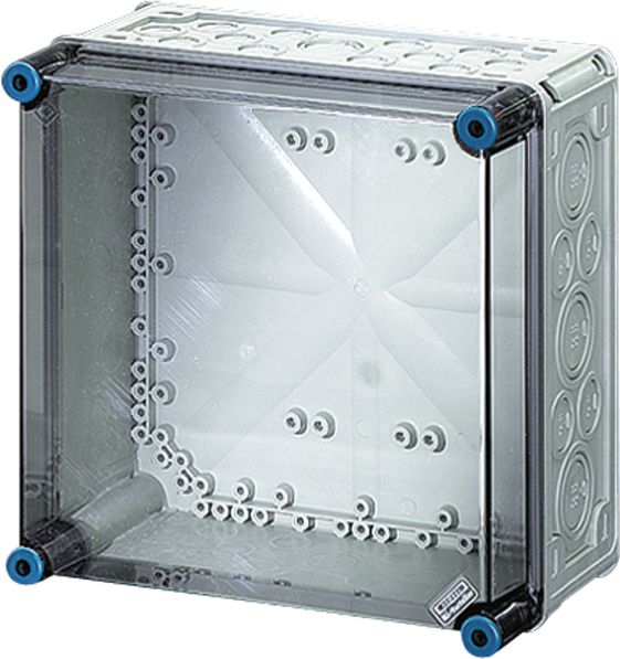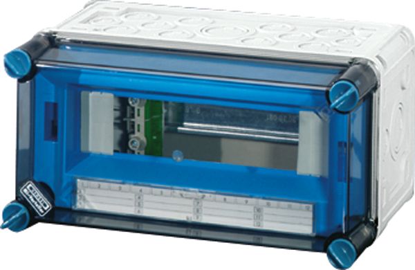 Gehäuse für den Bau von Energie-Schaltgerätekombinationen bis 630 A oder als Einzelgehäuse. Aus hochwertigem Polycarbonat schutzisoliert. Wanddurchführungen mit großen Öffnungen für die elektrische Verbindung der Gehäuse untereinander. Kabeleinführung an allen Gehäusewänden über metrische Vorprägungen oder Anbauflansche. Gehäuse zur Wandbefestigung auch über Außenlaschen oder mit Montageschienen. Automatengehäuse mit 36 Teilungseinheiten zum Einbau von Reiheneinbaugeräten nach DIN 43880. Mit zusätzlicher DIN-Trageschiene für Geräteeinbautiefe 72 mm. Ohne PE- und N-Klemmen. Mit Abdeckstreifen zum Verschließen von nicht benutzten Geräteausschnitten und Beschriftungsstreifen für die Stromkreiskennzeichnung. Transparenter Deckel, Deckelverschlüsse für Handbetätigung.