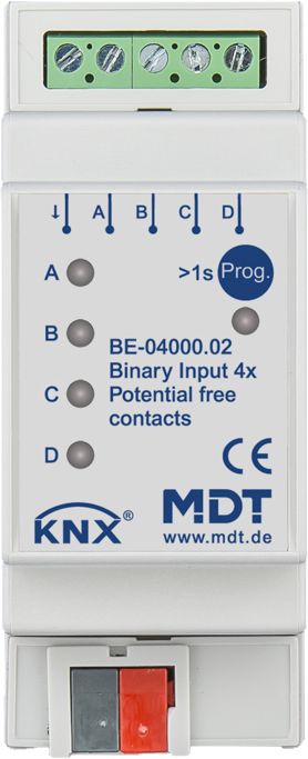 KNX Binäreingang 8-fach, 4TE REG, Ausführung potentialfrei. Ausführung zum Anschluss potentialfreier Kontakte. LED Anzeige für jeden Kanal, Leitungslänge max. 100 m. Zum Anschluss von Tastern, Schaltern, Fensterkontakten. Mehrfach-Tippfunktion sendet bis zu 4 Werte auf gleiche oder verschiedene Objekte. Innovative Gruppensteuerung mit langem/extra langem Tastendruck. 4 integrierte Logikmodule, z. B. zur Auswertung der Eingänge (Fenster geschlossen oder zweites Objekt senden). Schließer- und Öffnerbetrieb, Kontaktzustand senden. Dimmer- und Jalousiefunktion für Ein- und Zweitaster Betrieb. Werte senden, Zwangsführung. Szenen und Sperrobjekte für jeden Kanal. Kurzer/Langer Tastendruck mit 2 Objekten. Impuls- und Schaltzähler mit umfangreichen Zählerfunktionen (geeignet für 30ms S0 Impulse, z.B Eltako DSZ). Zyklisches Senden, Senden nach Reset. Intern erzeugte 12 V Kontaktspannung. 3