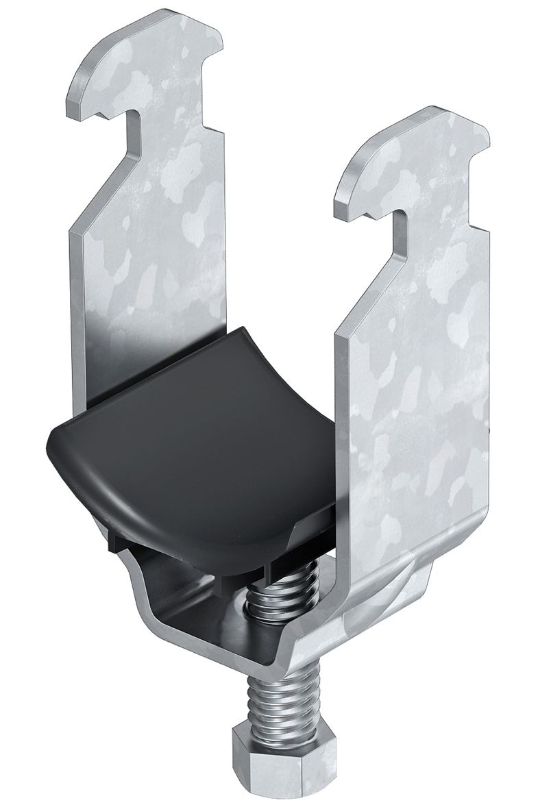 Bügelschelle, Befestigungssystem zur Befestigung von Leitungen, Kabeln, Leerrohren und Rohren in Kombination mit C-Profilschienen. Passend zu Profilschienen mit 16 - 17 mm Schlitzweite. Schelle und Schraube aus tauchfeuerverzinktem Stahl, Druckwanne aus Polypropylen, halogenfrei, Farbe: graphitschwarz RAL 9011