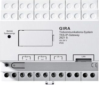 TKS-IP-Gateway Merkmale: TKS mobil Einbindung mobiler Endgeräte mit Android- oder iOs-Betriebssystem ins Gira Türkommunikationssystem. Gira TKS mobil App zu finden im App Store für iOS und Android. Beim Zugriff von unterwegs wird die Kommunikation über das integrierte Secure-Data-Access-Protokoll verschlüsselt, welches auch beim Gira S1 zum Einsatz kommt. TKS-Communicator Mit der Software TKS-Communicator können handelsübliche Computer sowie PC-basierte Bediengeräte über die Netzwerkanbindung als Wohnungsstation genutzt werden. Der TKS-Communicator bietet alle Funktionen einer Wohnungsstation Video, wie z. B. Gespräche annehmen, Licht schalten (in Verbindung mit einem Schaltaktor) oder Tür öffnen. Die Verbindung zum Gira HomeServer bzw. Gira FacilityServer über ein Plug-in ermöglicht die Darstellung im Gira Interface. Über Logikbausteine ist die Realisierung neuer Anwendungsmöglichkeiten, wie z. B. Zutrittskontrolle über die Gira Keyless In Produkte, möglich. Inbetriebnahme Der Inbetriebnahme-Computer muss über einen aktuellen Browser (z.B. Mozilla Firefox, Microsoft Edge, Opera, Safari, Chrome) verfügen. Hinweise: Folgende Lizenzmodelle stehen zur Verfügung: -262197: 5 gleichzeitig aktive TKS-Communicator -262198: 10 gleichzeitig aktive TKS-Communicator -262199: 20 gleichzeitig aktive TKS-Communicator Bei den Lizenzmodellen ist zu beachten, dass der TKS-Communicator auf beliebig vielen Endgeräten installiert werden darf. Die im Lizenzmodell angegebene Zahl gibt lediglich die Anzahl der gleichzeitig angemeldeten TKS-Communicatoren an. Zur Spannungsversorgung des TKS-IP-Gateways wird zusätzlich die Spannungsversorgung für Türkommunikation benötigt. Die Inbetriebnahme des TKS-IP-Gateways erfolgt per Web-Interface. Für die Inbetriebnahme über das Web-Interface muss der Inbetriebnahme-Computer über einen aktuellen Browser (z.B. Mozilla Firefox, Microsoft Internet Explorer, Opera, Safari, Chrome) verfügen. Einbindung handelsüblicher externer IP-Kameras im H.264 Standard (alle