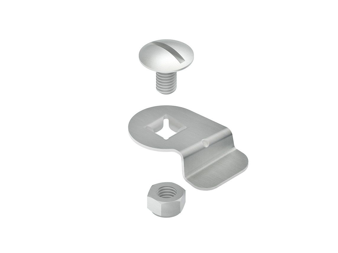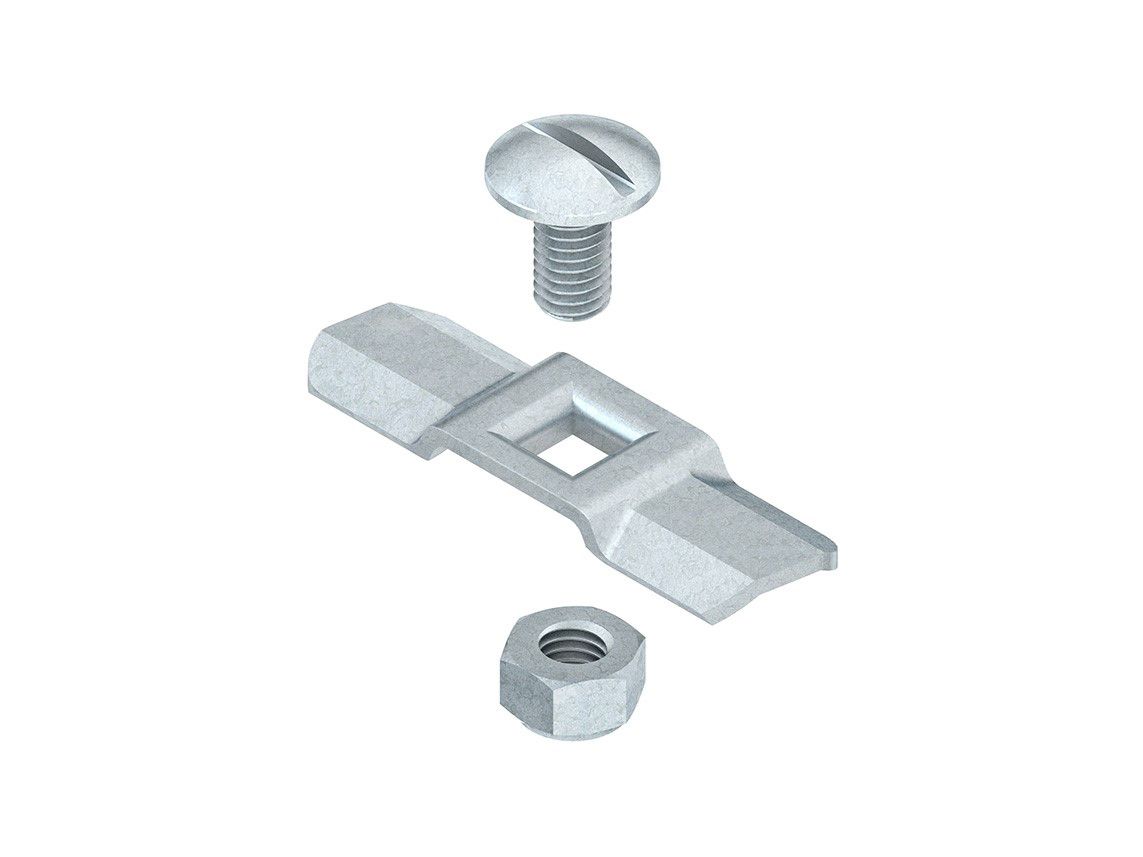 Drehriegel, zum nachträglichen bzw. zusätzlichen Einbau in Formstückdeckel von Kabelrinnen sowie für Formstückdeckel des begehbaren Kabelrinnensystems, für Verteilerrinnendeckel sowie für Weitspann Anbau T-Stück Deckel, einschließlich galvanisch verzinkter Flachrundkopfschraube mit Schlitz FL 6X12-S DIN 603 und galvanisch verzinkter Sicherungsmutter SMS 6 DIN EN ISO 10511. Eine Verwendung im Außenbereich, bedingt durch äußere Einflüsse wie z.B. Windlasten, ist nur mit einer zusätzlichen Sicherung (selbstschneidende Schrauben, Stahlband etc.) möglich. Bei der Befestigung ist darauf zu achten, dass ein Mindestabstand von = 50 mm zum Deckelanfang/-ende eingehalten werden muss. Des Weiteren ist zu beachten, dass der Schraubenkopfschlitz fluchtend mit der Befestigungslasche der Drehriegelplatte montiert wird. Dadurch wird eine spätere Kontrollmöglichkeit für das ordnungsgemäße Verschließen (Stellung des Schraubenkopfschlitzes) aller vorhandenen Drehriegel am Deckel gewährleistet. Verwendung für : Formstückdeckel von Kabelrinnen Formstückdeckel des begehbaren Kabelrinnensystems Verteilerrinnendeckel RDSV 50, RDSV 100 Weitspann Anbau T-Stück Deckel WTARDV ... Lieferung : unmontiert und lose Werkstoff Riegel :