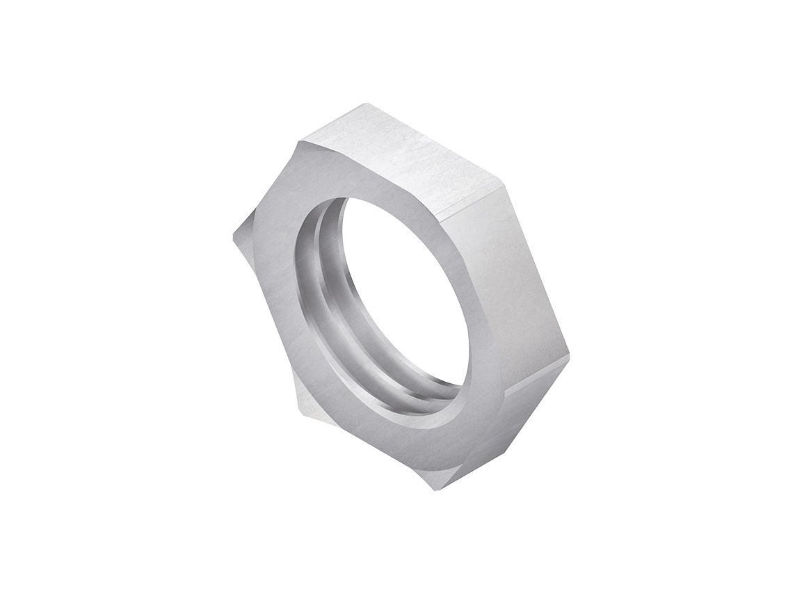 Sechskantmutter, mit metrischem Innengewinde nach DIN EN 60423. Nenngröße:M 40 Höhe:4,5 mm Schlüsselweite:46 mm Werkstoff:Messing, vernickelt