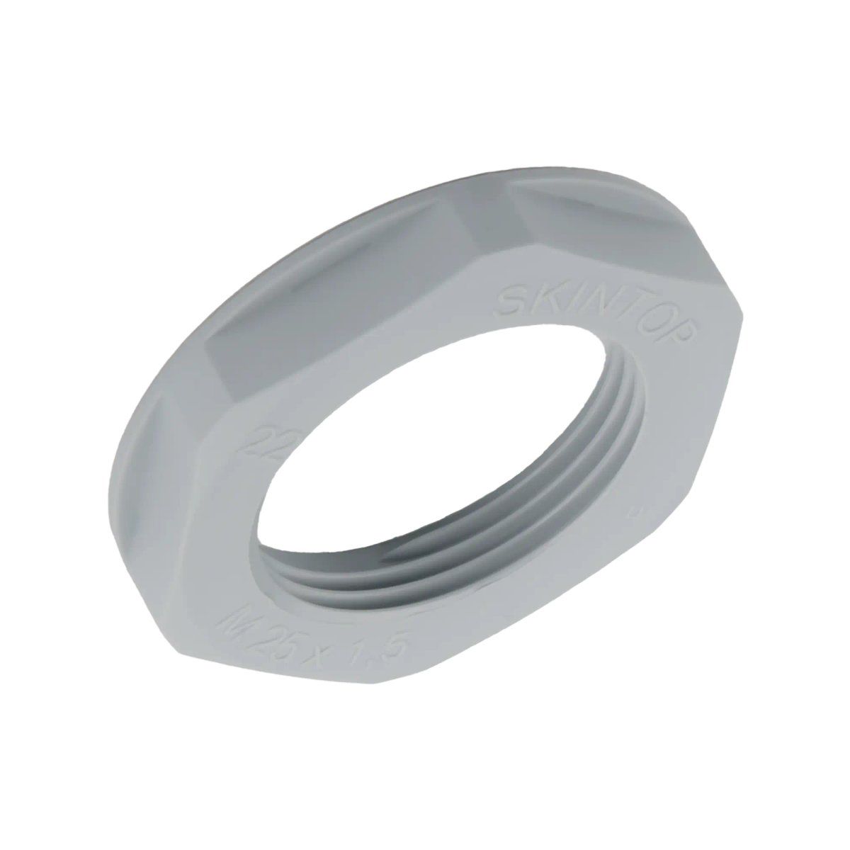 Gegenmutter SKINTOP GMP-GL-M 40X1.5 RAL 7035 LGY: Gegenmutter: M 40: Schlüsselweite: 50mm: lichtgrau: Polyamid: Halogenfrei: : Anwendungsgebiete: Ausführungen in schwarz sind UV-beständig und daher gut für den Außeneinsatz geeignet:Für dünnwandige Gehäuse ohne Gewinde, die nur eine Durchgangsbohrung erlauben:Zum Kontern einer SKINTOP /SKINDICHT Kabelverschraubung an der Innenseite der Anwendung (zB Gehäuse):Gute Öl- und chemische Beständigkeit: Nutzen: Auflagefläche begünstigt einfache Montage mittels Gabelschlüssel und schützt ein Gehäuse gleichzeitig vor Verkratzen:Selbstverlöschend gemäß UL94 V-2 (Entflammbarkeitstest für Kunststoffe) :Hohe Stabilität durch glasfaserverstärktes Polyamid:UL-Zertifizierung gemäß Technischen Daten ermöglicht Verwendung des Produkts im nordamerikanischen Raum (nur gültig in Kombination mit einer UL-zugelassenen SKINTOP Kabelverschraubung aus