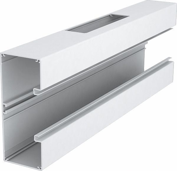 Geräteeinbaukanal ohne Bodenlochung zur direkten Wandmontage oder an Konsolen geeignet. Überlängen bis 6000 mm von Kanalunterteilen und -oberteilen sowie andere RAL-Farben können auf Anfrage realisiert werden. Die Sichtflächen der Geräteeinbaukanäle sind foliert.