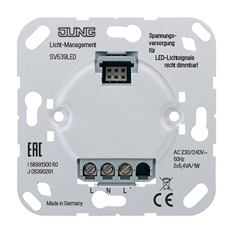 (Schraubbefestigung, ohne Befestigungskrallen) Das Netzteil dient ausschließlich zur Spannungsversorgung der LED-Lichtsignale (Art.-Nr. ..539..). Es ist nicht dimmbar. Nennspannung AC-Betrieb: AC 9 ... 36 V ~, 50 Hz DC-Betrieb: DC 12 ... 48 V Umgebungstemperatur: 0 ... +40 °C Anschlüsse: F1, ?, F2 Schutzklasse (bei montiertem Aufsatz): II Leistungsaufnahme (bei montiertem Aufsatz) AC-Betrieb: 2 x 1,5 VA DC-Betrieb: 2 x 1,0 W Anschluss Schraubklemmen Max. klemmbarer Leiterquerschnitt: 2 x 2,5 mm2 oder 1 x 4 mm2