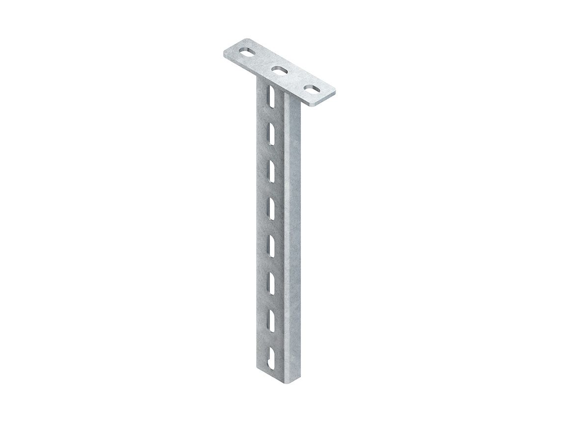 Hängestiel, U-Profil mit angeschweißter Kopfplatte, System HUF 50/..., für Ausleger zur ein- und beidseitigen Verlegung, beidseitige Anordnung der Ausleger horizontal auf gleicher Höhe mittels Distanzstück UD 24 möglich. Aus statischen Gründen und um ein problemloses Aufsetzen der Schutzkappe zu ermöglichen, muss der Ausleger im Abstand von x=50 mm (Auslegerunterkante bis Hängestielende), oberhalb des Hängestielendes montiert werden. Zur Verwendung im Funktionserhalt bitte Zusatzvorschriften beachten! VDE zertifiziert! für Ausleger : KTUL... KTUM... für Doppelausleger : KTDL... für Zentralabhängung : ZKU... = 400 mm Länge für Ausleger : KTUG... = 400 mm Länge (Funktionserhalt) für Ausleger : KTU... = 400 mm Länge in Verbindung mit Konsolenadapter KAWG 12 (Funktionserhalt) Abmessungen (ca. Maße) Kopfplatte L x B x t : 140 x 40 x 5 mm Befestigungslochung : 13 x 20 mm mittiger Abstand : 100 mm U-Profil : 50 x 22 x 2 mm Profillochung, einreihig : 12 x 30 mm mittiger Abstand : 50 mm Gesamtlänge L : 301 mm Werkstoff : Stahl, tauchfeuerverzinkt nach DIN EN
