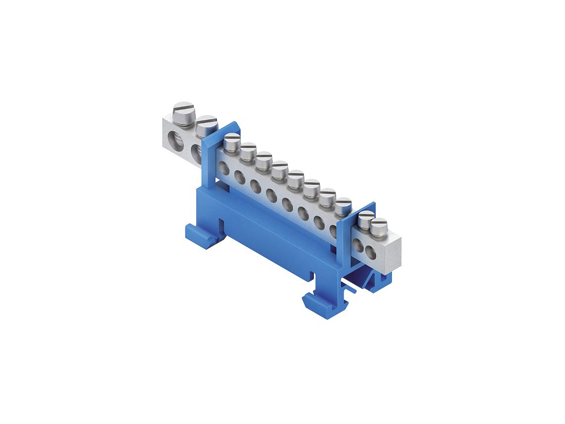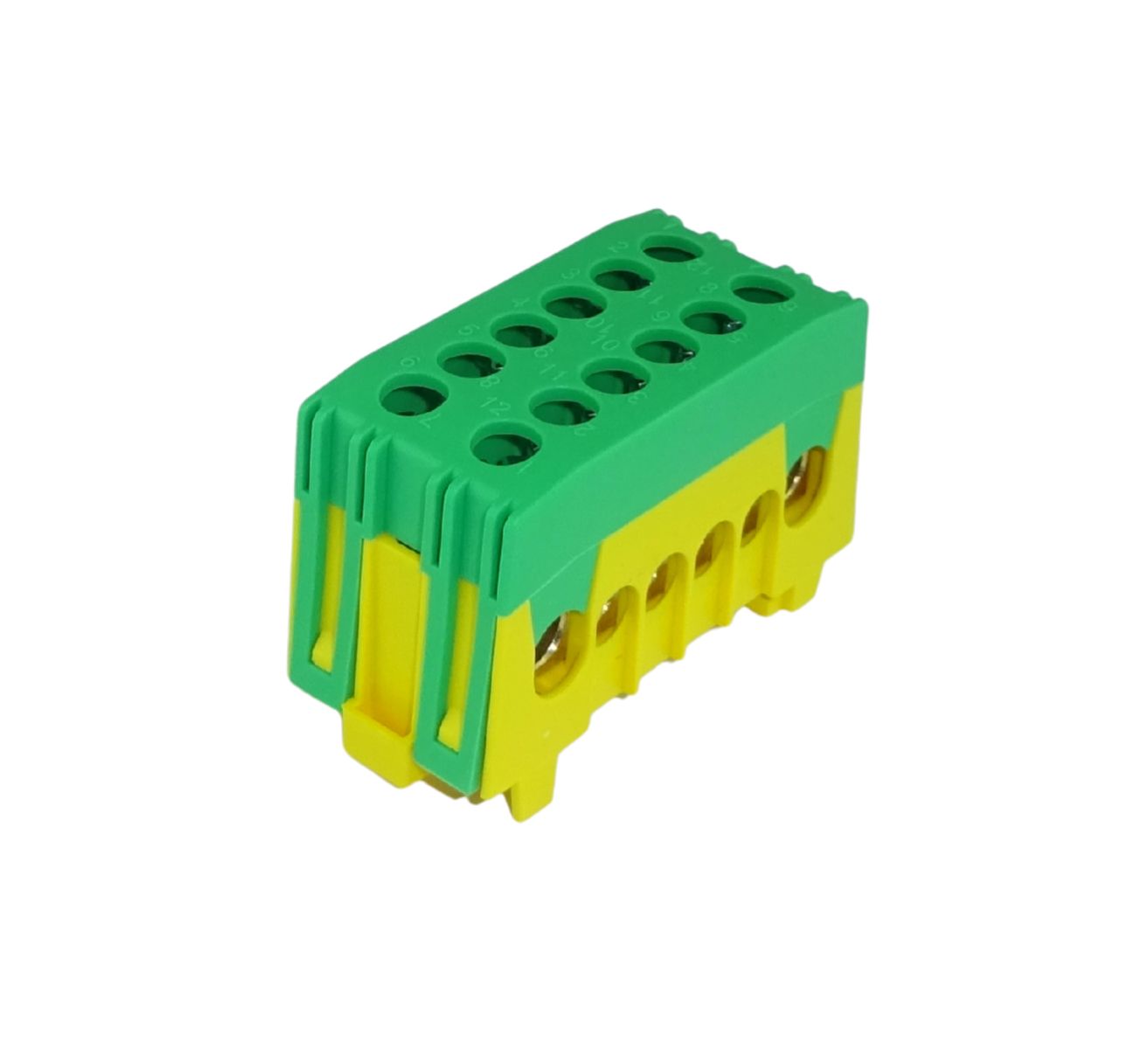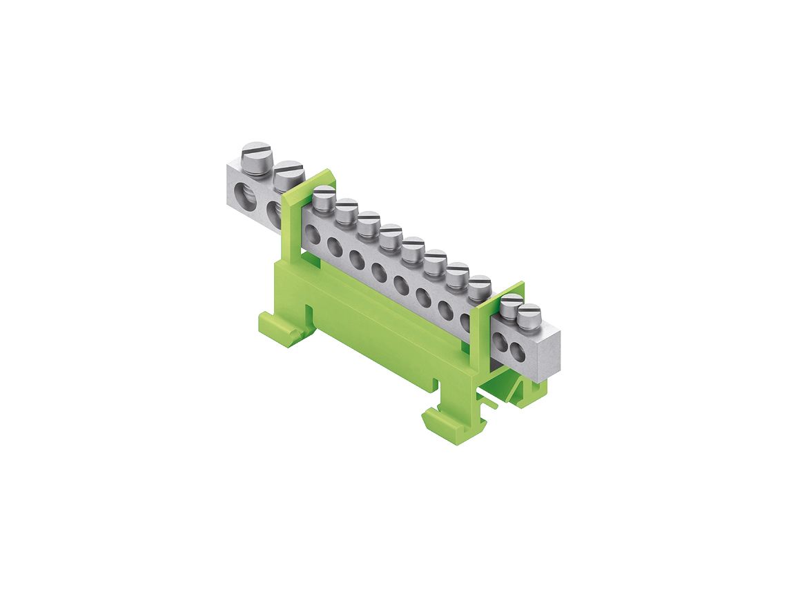 Null- und Schutzleiterklemme zum Aufschnappen auf Tragschiene TS 35 mm deren Anschlussmaße DIN EN 60715 entsprechen, halogenfrei. Abmessungen (ca. Maße) Höhe H x Breite B x Länge L : 28 x 23,5 x 80 mm Klemmbereich Zugang eindrähtig, starr : 6,0 - 16,0 mm² Anschlussmöglichkeiten Zugang eindrähtig, starr : 1 x 6,0 mm², 1 x 10,0 mm², 1 x 16,0 mm² Klemmbereich Abgang eindrähtig : 4,0 - 10,0 mm² Klemmbereich Abgang starr : 4,0 - 6,0 mm² Anschlussmöglichkeiten Abgang eindrähtig : 1 x 4,0 mm², 1 x 6,0 mm², 1 x 10,0 mm² Anschlussmöglichkeiten Abgang starr : 1 x 4,0 mm², 1 x 6,0 mm² Klemmstellen : 12 Werkstoff Isolierteil : PA Werkstoff Klemmschiene : galvanisch vernickelter Messing Werkstoff Klemmschrauben : galvanisch verzinkter Stahl Temperaturbereich : -30°C bis 80°C