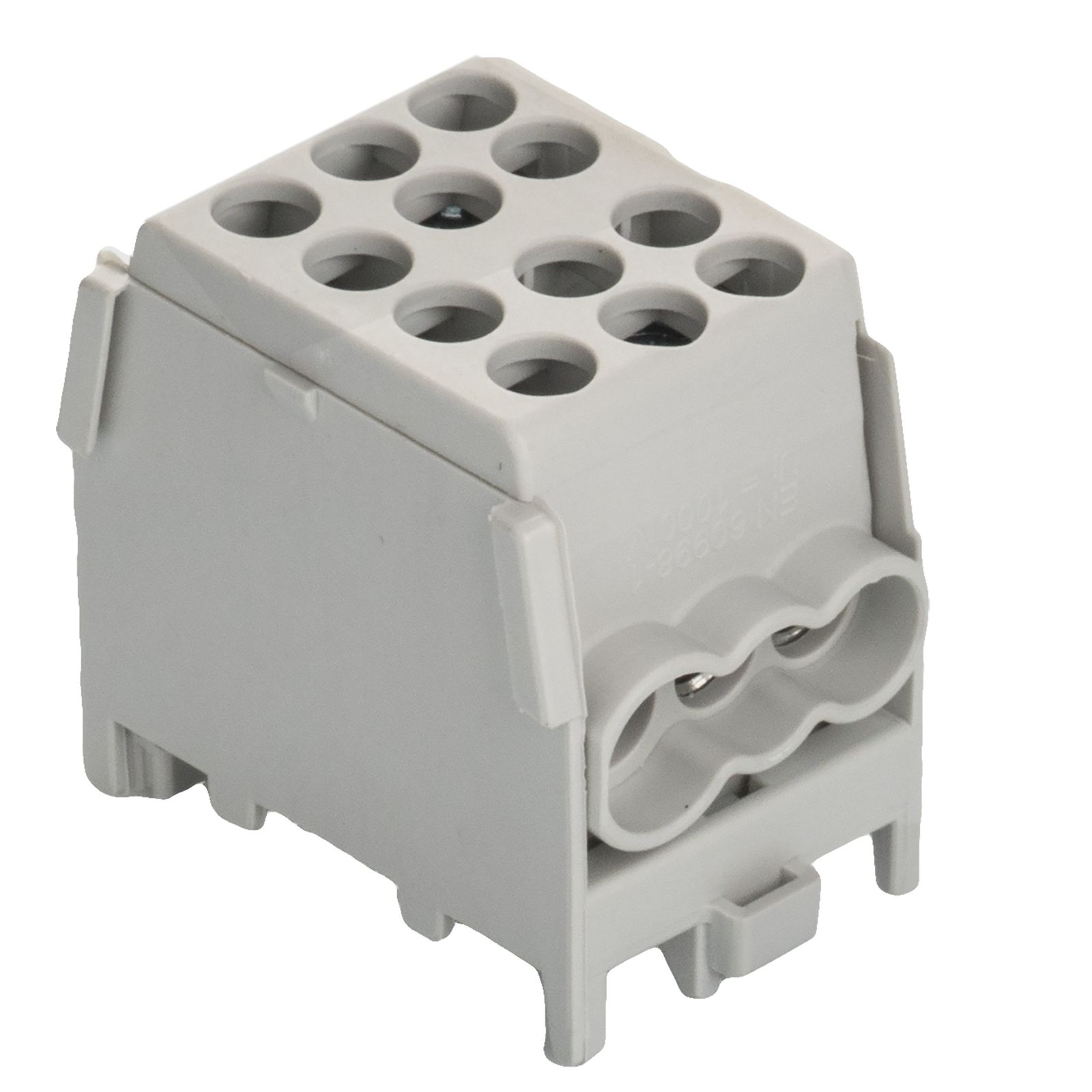 Hauptleitungsklemme, Minimodular anreihbar, leiterfarbenkonform, PV-geeignet. Zur Montage auf Tragschiene 35 mm gem. EN 60715, für Kleinverteiler und Zählerplätze AC 400 V gem. VDE 0603. Buchsenklemme mit je 2 Schrauben pro Klemmstelle, Schrauben mit Kombischlitz-Pozidriv Z2. Aufbau: Klemmkörper: Messing verzinnt: Klemmschrauben: Stahl, verzinkt: Isoliergehäuse: Kunststoff (Polyamid) schlagzäh, flammgeschützt, halogenfrei, für Aluminiumleiter (eindrähtig) geeignet. Die angegebenen Querschnitte beziehen sich auf ein oder mehrdrähtige Leiter. Für feindrähtige Leiter mit Aderendhülsen ist der nächstkleinere Querschnitt zu wählen.