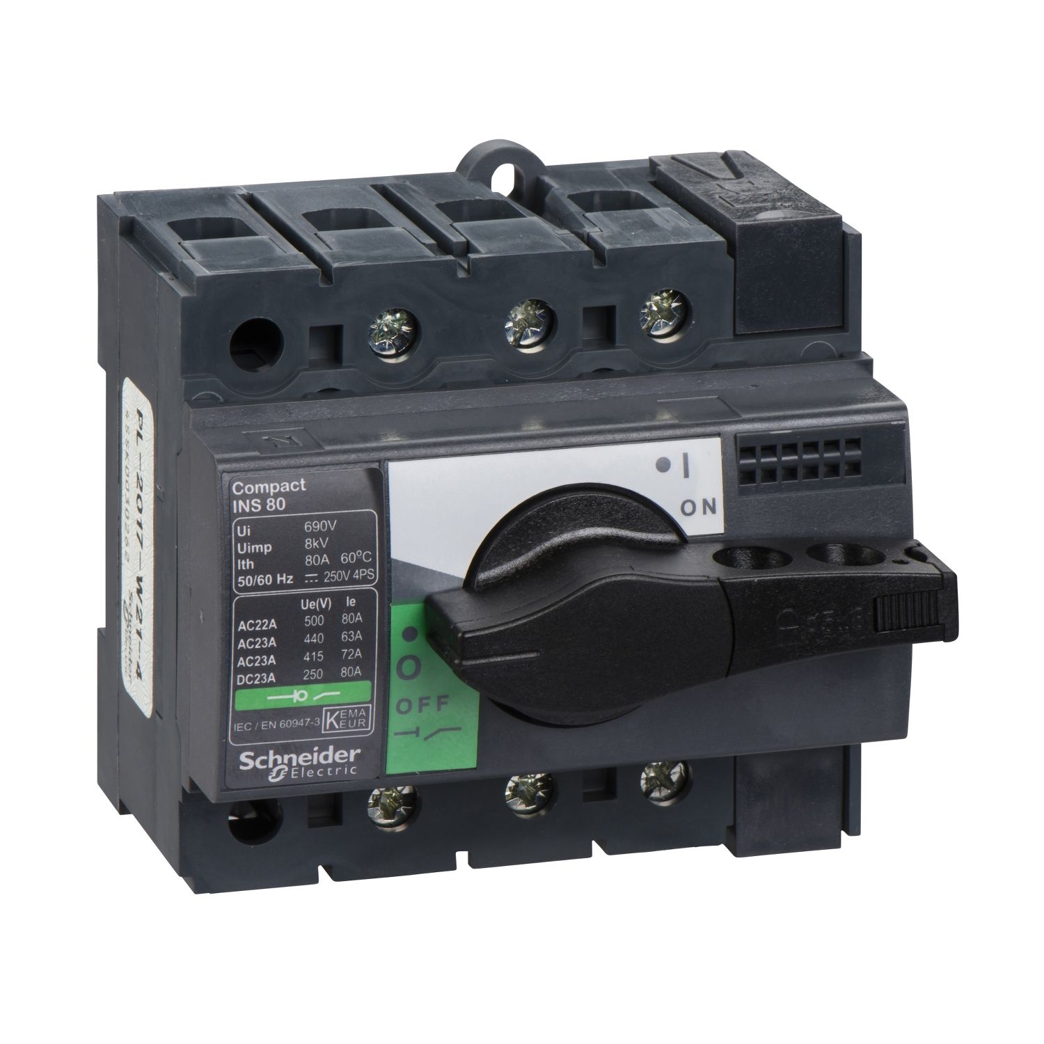 Compact INS Lasttrennschalter. Lasttrennschalter INS250, 250A/690V AC / 250V DC, Drehantrieb schwarz. Nennstrom 250 A, Polzahl 3. Komplettgeräte mit schwarzem Schalthebel. Trennereigenschaften nach VDE 0660 Teil 100. Drehantrieb frontal oder seitlich bis INS250.