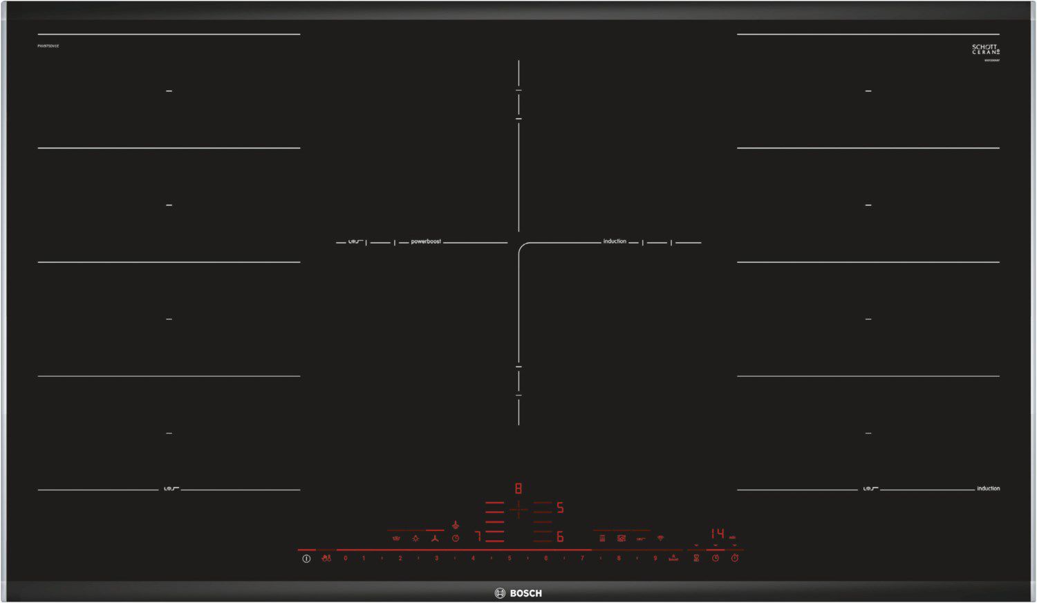 90 cm: Platz für 5 Töpfe oder Pfannen Flexibilität der Kochzonen 3 varioInduktions-Kochzonen: Verwende Kochgeschirr beliebiger Form und Größe innerhalb der 40 cm langen Zone. Kochzone vorne links: 240 mm, 200 mm, 2.2 kW (maximale Leistung 3.7 kW) Kochzone hinten links: 200 mm, 240 mm, 2.2 kW (maximale Leistung 3.7 kW) Kochzone hinten: 300 mm, 240 mm, 2.6 kW (max. Leistung 3.7 kW) Kochzone hinten rechts: 200 mm, 240 mm, 2.2 kW (maximale Leistung 3.7 kW) Kochzone vorne rechts: 200 mm, 240 mm, 2.2 kW (maximale Leistung 3.7 kW) Benutzerfreundlichkeit Dual lightSlider: Steuere die Leistung direkt über die beiden beleuchteten Touch Leisten (nicht sichbar im ausgeschalteten Zustand). 17 Leistungsstufen: Stelle die Hitze mit 17 Leistungsstufen (9 Hauptstufen und 8 Zwischenstufen) präzise ein. Warmhaltefunktion: Warmhalten von Speisen bei voreingestellter niedriger Leistungsstufe. Timer mit Abschaltfunktion: Schaltet die Kochzone am Ende der eingestellten Zeit aus (z. B. bei gekochten Eiern). Timer: Am Ende der eingestellten Zeit ertönt ein Signal (z. B. beim Pastakochen). Laufzeitanzeige: Zeigt an, wie viel Zeit seit dem Starten des Timers vergangen ist (z. B. beim Kochen mit Kartoffeln). Zeitersparnis und Effizienz powerBoost-Funktion für alle Kochzonen: Mit 50 % mehr Leistung z. B. Wasser schneller zum Kochen bringen als auf höchster Leistungsstufe. powerBoost-Funktion für Pfannen: Erhitzt Pfannen schneller als auf höchster normaler Leistungsstufe und schützt gleichzeitig die Pfannenbeschichtung. Automatisches Verbinden / Teilen: Wird großes Kochgeschirr auf die Flex Zone gestellt, verbindet das Kochfeld automatisch zwei Kochzonen zu einer großen, durchgehenden Zone. powerMove Plus: Erhöht oder verringert die Leistung einfach durch Verschieben des Topfes nach vorne, in die Mitte oder nach hinten. varioMotion: Wenn du einen Topf auf eine andere Kochzone stellst (Flex Zone), überträgst du alle vorherigen Einstellungen durch einmaliges Bestätigen in die neue Zone. Automatische Auswahl der Zonen: Nachdem das Kochfeld eingeschaltet wurde wählt es automatisch die Flex-Kochzone aus, auf die ein neues Kochgeschirr gestellt wurde. Die Bedienung der flexiblen Kochzone passt sich der Größe des Kochgeschirrs an. Einstellungen beim Verschieben eines Topfes oder einer Pfanne gleichen sich an. quickStart: Beim Einschalten wählt das Kochfeld automatisch die Kochzone aus, auf dem im ausgeschalteten Zustand Kochgeschirr platziert wurde. reStart: Im Falle von unbeabsichtigtem Ausschalten des Kochfeldes bleiben alle Einstellungen erhalten, wenn du innerhalb von 4 Sekunden wieder einschaltest. Kochunterstützung Bratsensor Plus mit 5 Temperaturstufen: Verhindert ein Anbrennen durch die automatische Temperaturregelung des Sensors. Design Rahmen: Facetten-Design vorne, Metallleisten an den Seiten Sicherheit 2-stufige Restwärmeanzeige je Kochzone: Zeigt an, welche Kochzonen noch heiß oder warm sind. erhöhten Berührungsschutzung: Verhindert eine unbeabsichtigte Aktivierung des Kochfeldes. Wischschutzfunktion: Übergekochte Flüssigkeiten abwischen, ohne die Einstellungen unbeabsichtigt zu ändern (30 Sekunden sind alle Touch-Tasten blockiert). Hauptschalter: Alle Kochzonen auf einmal ausschalten. Automatische Sicherheitsabschaltung: Aus Sicherheitsgründen schaltet sich das Kochfeld nach einer voreingestellten Zeit ohne Interaktion automatisch ab. Energieverbrauchsanzeige: Zeigt den Stromverbrauch des letzten Kochvorgangs an. Installation Maße des Gerätes (HxBxT mm): 51 x 912 x 520 Erforderliche Nischenmaße (HxBxT mm): 51 x 880 x (490 - 500) Minimale Arbeitsplattenstärke: 16 mm Gesamtanschlusswert: 11100 W powerManagement Funktion: Bei Bedarf die maximale Leistung begrenzen (abhängig von der Absicherung der Elektroinstallation). Netzkabel: 110 cm,
