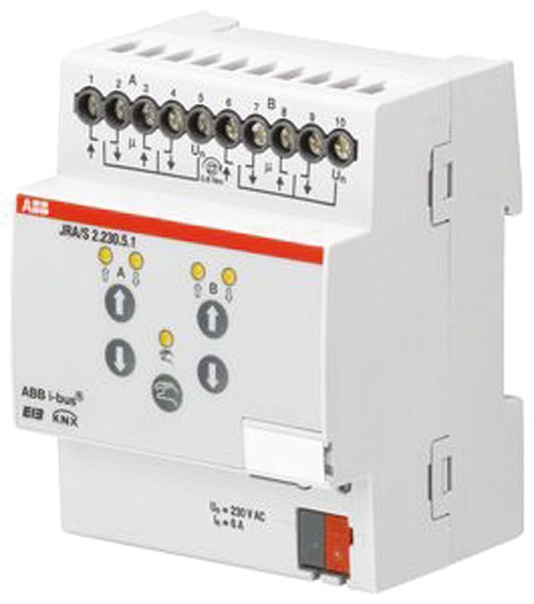 Zum Steuern von 2 voneinander unabhängigen Gruppen von je zwei 230 V AC-Antrieben zum Positionieren von Jalousien, Rollläden, Markisen und anderen Behängen sowie zum Steuern von Türen, Fenstern und Lüftungsklappen. Mit automatischer Fahrzeitermittlung und manueller Bedienung direkt am Gerät. Keine Hilfsspannung nötig. Die Ausgänge sind elektromechanisch gegeneinander verriegelt. Funktionen: Auf/Ab, Lamellenverstellung/Stopp, Positions- und Szenensteuerung, Sicherheitsfunktionen, Sonnenschutz- und Heizen/Kühlen-Automatik, Statusmeldungen. : KNX