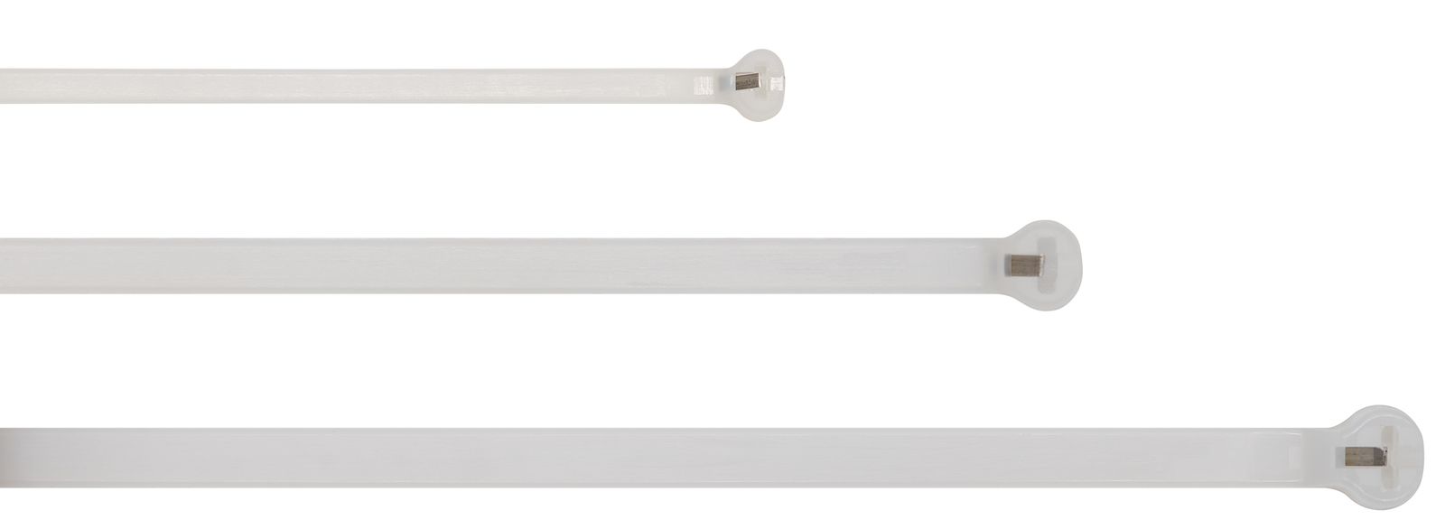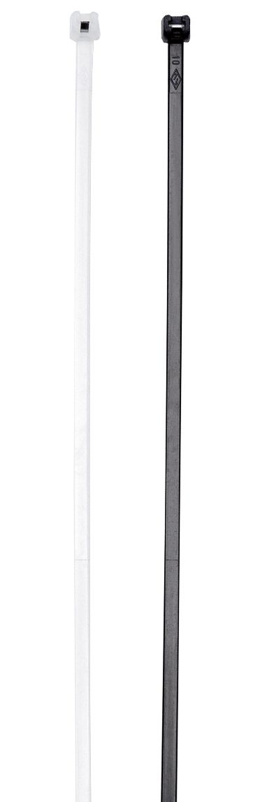 Kabelbinder mit Stahlzunge, aus Polyamid 6.6. Mit antimagnetischer, korrosionsbeständiger Stahlzunge, temperaturbeständig von -40°C bis +85°C, selbstverlöschend gemäß UL 94 V-2, halogenfrei.