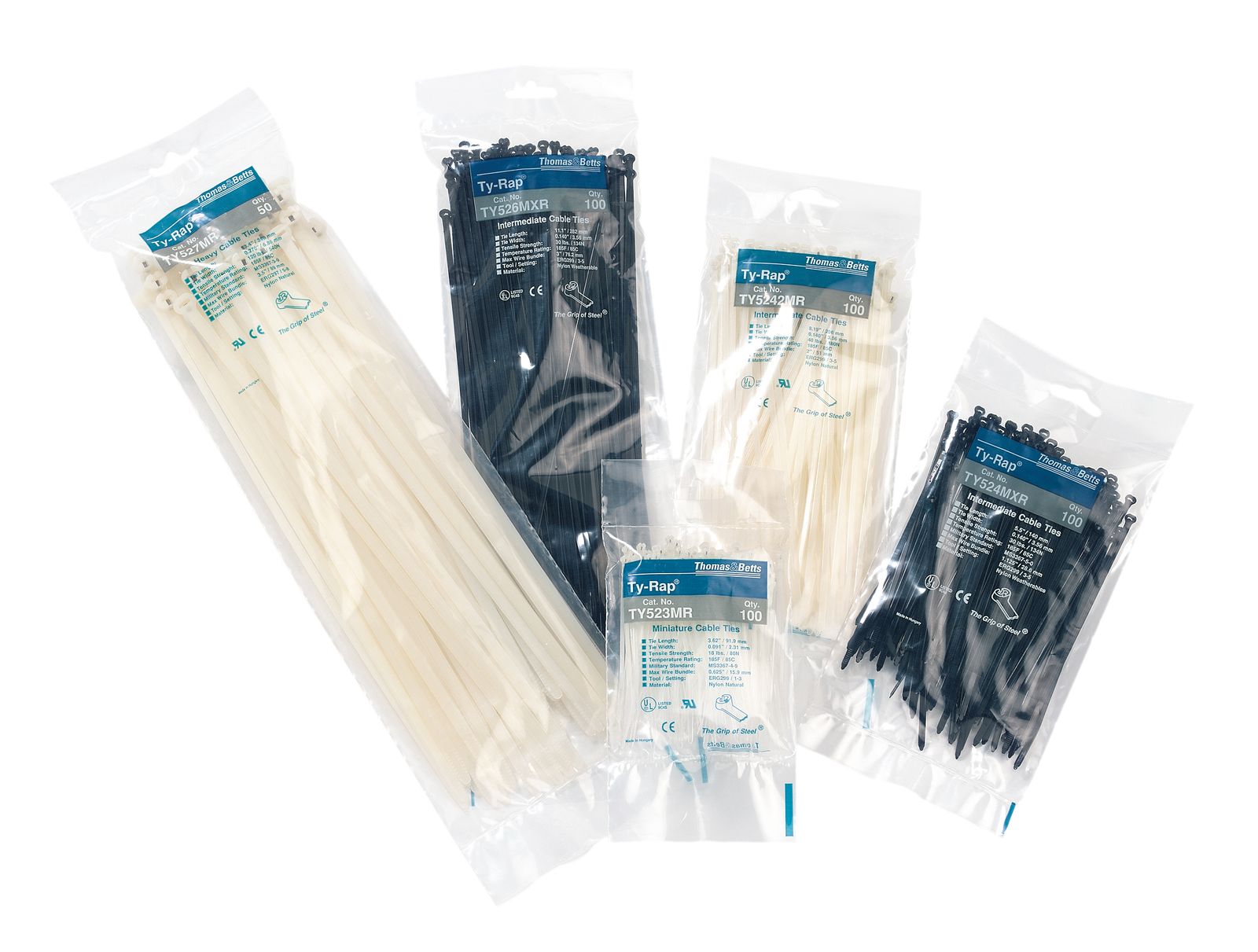 Der schwarz UV-beständige Ty-Rap Stahlnasenkabelbinder aus Polyamid 6.6 ist in mehreren Längen und Breiten und unterschiedlichen Zugfestigkeiten erhältlich. Diese Baureihe ist speziell für Installationen im Außenbereich geeignet. Der Kabelbinder ist in recycelbaren Kunststoffbeuteln mit Eurolochung verpackt und beinhaltet 2% Carbon für Militärspezifikationen. Die korrosionsbeständige, antimagnetische Stahlnase aus dem Edelstahl Typ 316 im Kabelbinderkopf garantiert den stärksten und sichersten Halt, der am Markt zu finden ist. Der leistungsstarke und zuverlässige Ty-Rap kann unter widrigsten Bedingungen wie unter Vibrationen, Hitze oder Kälte eingesetzt werden. Die abgerundeten Kanten und Konturen des Kopfes und des Binders sorgen für eine anwenderfreundliche Handhabung und verhindern, dass die Isolation der Kabel und Leitungen durch scharfe Kanten oder Verzahnungen beschädigt werden. Zudem reduziert der glatte Körper ohne Rasterzähne oder Rillen die Zahl überbeanspruchter Stellen. Die leichte Noppung auf der Innenseite des Bandes gewährleistet einen festen Sitz des Binders auf dem Kabelbündel. Eine große Auswahl an
