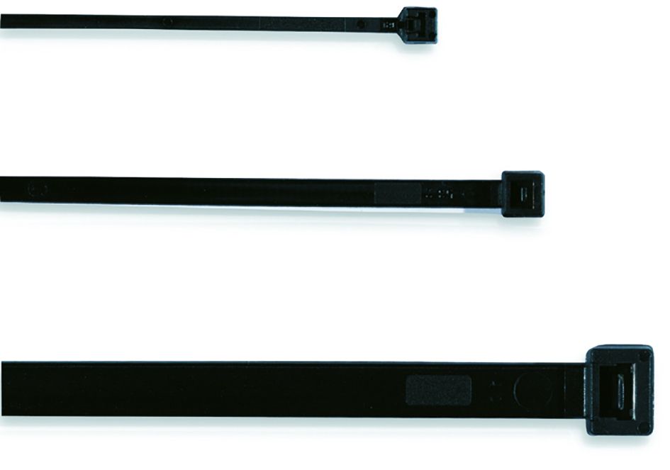 Kabelbinder aus Polyamid 6.6. Selbstverlöschend gemäß UL 94 V-2, halogenfrei. Anwendungsbereich: -40°C bis +85°C. Beständig gegen: Alkalien, Öle, Ölprodukte, Schmierfette, Chloratlösungsmittel, Witterung. Begrenzte Säurebeständigkeit. Keine Beständigkeit gegen Phenole. UV-stabilisiert.