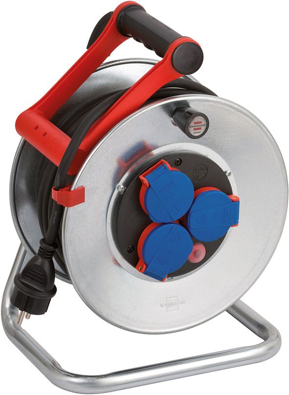 Kabeltrommel für den Außenbereich. Konform mit BGI 608. 3 Schutzkontakt-Steckdosen mit Klappdeckel. Adern Gummi, Mantel Neoprene. Aderquerschnitt 1,5 mm². Kabel: schwarz. Trommel: schwarz o. silber. Kategorie K2.