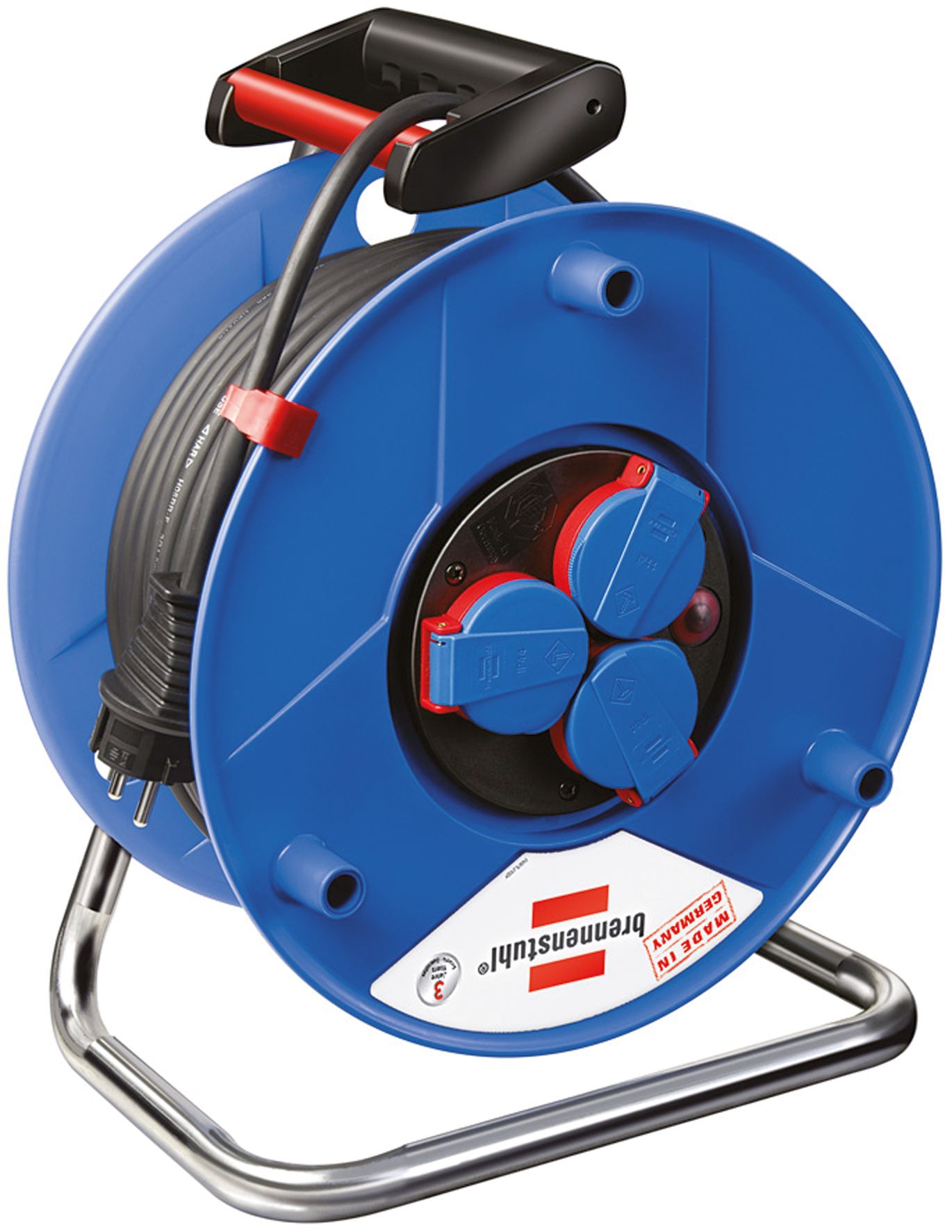 Kabeltrommel mit 4 Schutzkontakt-Steckdosen. Zentralstecker mit doppeltem Schutzkontaktsystem. Aderquerschnitt 1,5 mm². Kabel: schwarz. Trommel: schwarz. Ohne Kabel.
