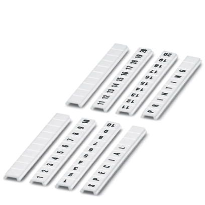 Zackband flach, Streifen, weiß, unbeschriftet, beschriftbar mit: PLOTMARK, CMS-P1-PLOTTER, Montageart: verrasten, für Klemmenbreite: 5 mm, Anzahl der Einzelschilder: 10, Textfeldhöhe: 5,15 mm, Textfeldbreite: 5,15 mm