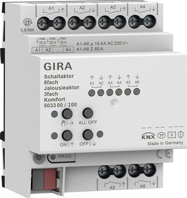 Schaltaktor 24fach 16A / Jalousieaktor 12fach 16A Komfort für KNX Merkmale: Jalousie- oder Schaltbetrieb parametrierbar. Im Jalousiebetrieb werden jeweils die nebeneinanderliegenden Ausgänge (A1/A2, A3/A4 - ) zu einem Jalousieausgang zusammengefasst. Mischbetrieb an einem Aktor (bspw. A1 & A2 Jalousie, A3 & A4 Jalousie, A5 Schalten, A6 Schalten - ) möglich. Bis zu 8 unabhängige Logikfunktionen zur Realisierung einfacher oder komplexer logischer Operationen. Aktiv sendende Rück- oder Statusmeldungen lassen sich nach Busspannungswiederkehr oder nach einem ETS-Programmiervorgang global verzögern. Handbedienung der Ausgänge unabhängig vom KNX mit intelligenten LED-Statusanzeigen zur Energieeinsparung. Erweiterte Handbedienung: Wechsel zwischen Jalousie- und Schaltbetrieb vor der ETS Inbetriebnahme. Heartbeat-Funktion zur Überwachung des Geräts, zyklisches Senden 1Bit. Bistabile Relais. Versorgung aus KNX Bus, keine zusätzliche Spannungsversorgung erforderlich. Vereinfachter Klemmanschluss (keine Klemmenüberlagerung). Vereinfachte Konfiguration durch separate Vorlagenkanäle für die Funktionen Jalousie/Rolllade/Markise und Schalten denen die einzelnen Kanäle bequem zugewiesen werden können. Jalousiefunktionen Betriebsart parametrierbar: Ansteuerung von Lamellenjalousien, Rollläden, Markisen, Dachfenstern oder Lüftungsklappen. Separat parametrierbare Behangfahrzeiten mit Fahrzeitverlängerung für Fahrten in die obere Endlage. Bei Lamellenjalousien ist unabhängig eine Lamellenfahrzeit parametrierbar. Umschaltzeit bei Fahrtrichtungswechsel und Zeiten für Kurz- und Langzeitbetrieb (Step, Move) einstellbar. Reaktion bei Busspannungswiederkehr und nach einem ETS-Programmiervorgang für jeden Ausgang einstellbar. Zentrale Ansteuerung aller Jalousieausgänge über bis zu 6 Langzeitobjekte möglich (AUF, AB, permanent AUF, permanent AB). Rückmeldung der Behangposition oder der Lamellenposition. Zusätzlich können eine ungültige Behangposition oder eine Antriebsfahrt rückgemeldet werden. Zuordnungen auf bis zu 5 verschiedene Sicherheitsfunktionen (3 Windalarme, 1 Regenalarm, 1 Frostalarm), wahlweise mit zyklischer Überwachung. Die Sicherheitsfunktionen (Objekte, Zykluszeiten, Priorität) werden geräteorientiert gemeinsam für alle Ausgänge angelegt. Eine Zuordnung einzelner Ausgänge auf die Sicherheitsfunktionen und die Sicherheitsreaktionen sind kanalorientiert parametrierbar. Statusmeldungen für obere und untere Endlage. Dämmerungsfunktion. Eine umfangreiche Sonnenschutzfunktion mit festen und variablen Behang- oder Lamellenpositionen zu Beginn oder am Ende der Funktion separat für jeden Ausgang aktivierbar. Inklusive dynamischem Lamellenoffset für Lamellenjalousien. Auch mit erweitertem Sonnenschutz zur Einbindung in komplexere Beschattungssteuerungen (verfügt über separate Automatik- und Sperrobjekte). Dabei wahlweise auch mit Heizen-/Kühlenautomatik und Präsenzfunktion. Optionale Deaktivierung der Sonnenschutzautomatik über direkte Bedienung. Tuchstraffungsfunktion für Markisen. Erweiterte Sperrfunktion mit Quittierungsoption. Lüftungsfunktion für Fenster mit Fensterkontakten. Erweiterte Lüftungsfunktion für geöffnete und gekippte Fenster sowie Tag-/Nachtbetrieb. Intelligente Teachingfunktion für Behangfahrzeiten für alle Kanäle separat. Interne Gruppenkommunikation zur kanalübergreifenden Fahrzeitkonfiguration. Optimierung des einlernen der Fahrzeiten durch Vernetzung der Kanäle über interne Gruppenkommunikation. Übertragung der Fahrzeiten auf andere Geräte möglich. Zwangsstellungsfunktion oder Sperrfunktion für jeden Jalousieausgang realisierbar. Bis zu 64 interne Szenen sind je Ausgang parametrierbar. Szenenspeicherfunktion: Zusätzliche visuelle Rückmeldung. Erweiterer Szenenabruf (Toggeln von Szenen). Drehrichtung umkehren über ETS Parameter. Türkontaktauswertung für Aussperrschutz bei Terrassen- oder Balkontüren. Schaltfunktionen Unabhängiges Schalten der Schaltausgänge. Schließer- oder Öffnerbetrieb. Zentrale Schaltfunktion über bis zu 6 Schaltobjekte (EIN, AUS, permanent EIN, permanent AUS) und Sammelrückmeldung. Rückmeldung Schalten: bei Änderung oder zyklisch auf den Bus sendend. Reaktion bei Busspannungsausfall bzw. Busspannungswiederkehr und nach einem ETS-Programmiervorgang für jeden Ausgang vollständig einstellbar. Logische Verknüpfungsfunktion einzeln für jeden Ausgang. Sperrfunktion für jeden Kanal parametrierbar. Alternativ Zwangsstellungsfunktion separat für jeden Ausgang. Erweiterte Sperrfunktion mit Quittungsoption und Rückmeldeobjekt. Zeitfunktionen (Ein-, Ausschaltverzögerung, Treppenlichtfunktion - auch mit Vorwarnfunktion). Einbeziehung in Lichtszenen möglich: Bis zu 64 interne Szenen sind je Ausgang parametrierbar. Betriebsstundenzähler einzeln für jeden Ausgang aktivierbar. Eingangsüberwachung auf zyklische Aktualisierung des Schalten-Objekts mit Sicherheitsstellung. Rückmeldung des kombinierten Funktionsstatus mit einem standardisierten und einem erweiterten Kommunikationsobjekt. Logikfunktionen Das Gerät verfügt über acht interne Logikfunktionen. Logikgatter (UND, ODER, exklusives UND, exklusives ODER, je mit bis zu 4 Eingängen). 1-Bit-auf-1-Byte-Umsetzer mit Eingangsfilter, Sperrobjekt und Vorgabe der Ausgabewerte. Sperrglied mit Filter- und Zeitfunktionen und Sperrobjekt. Vergleicher für Werte mit neun verschiedenen Eingangsdatenformaten und vielen Vergleichsoperationen. Grenzwertschalter mit Hysterese mit oberem und unterem Schwellwert bei neun verschiedenen Eingangsdatenformaten, inkl. Vorgabe der 1-Bit-Ausgabewerte. Die Logikfunktionen besitzen eigene KNX Kommunikationsobjekte und können Telegramme des Aktors oder anderer Busgeräte verarbeiten. Hinweise: KNX Data Secure kompatibel. Schneller Download der Applikation (Long Frame Support). Firmware-Updates sind mit der Gira ETS Service App (Zusatzsoftware) möglich. Montage auf DIN-Hutschiene. Lieferumfang: Anschluss- und
