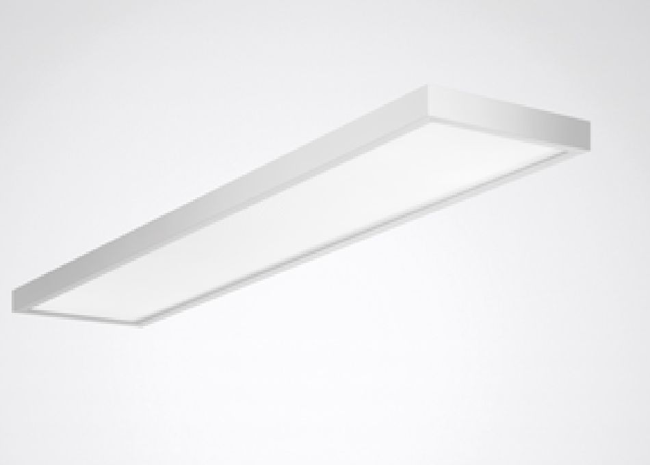 LED-Deckenanbauleuchte mit transluzenter PMMA-Abdeckscheibe. Für die Deckenmontage in Innenräumen. Abdeckscheibe aus transluzentem PMMA mit lichttechnisch wirksamer Prismenstruktur. Mit symmetrisch begrenzt breit strahlender Lichtstärkeverteilung. Blendungsbewertung nach UGR-Einstufung (EN 12464-1) < 19. Leuchtenlichtstrom in 2 Stufen einstellbar (Multilumen). Bemessungslichtstrom 5700 lm, Bemessungsleistung 49 W, maximale Leuchten-Lichtausbeute 122 lm/W. Lichtfarbe warmweiß oder neutralweiß, ähnlichste Farbtemperatur (CCT) 3000 K oder 4000 K, allgemeiner Farbwiedergabeindex (CRI) Ra > 80. Farborttoleranz (initial MacAdam) = 4 SDCM. Mittlere Bemessungslebensdauer L80 (tq 25 °C) = 50.000 h. Flimmern: Pst LM = 1,0 bei Volllast. Stroboskop-Effekt: SVM = 0,4 bei Volllast. Leuchtenkörper aus Aluminium. Oberfläche weiß beschichtet (ähnlich RAL 9016). Maße (L x B): 1502 mm x 302 mm, Leuchtenhöhe 50 mm. Schutzklasse (EN 61140): I, Schutzart (DIN EN 60529): IP20, Stoßfestigkeitsgrad nach IEC 62262: IK02, Prüftemperatur Glühdrahttest gemäß IEC 60695-2-11: 650 °C. Zulässige Umgebungstemperatur (ta): 25 °C . Gewicht: 4,2 kg. Mit elektronischem Betriebsgerät, digital dimmbar (DALI). Betriebsgerät gemäß DALI-2-Standard (EN 62386). Leuchte mittels Tastfunktion über DALI-Steuerklemmen schalt- und dimmbar (Touch DIM). Das Betriebsgerät ist entsprechend der Ökodesign-Anforderungen (VO (EU) 2019/2020) austauschbar. Das Produkt erfüllt die grundlegenden Anforderungen der anwendbaren EU-Richtlinien und des Produktsicherheitsgesetzes und trägt die CE-Kennzeichnung. Zusätzlich ist die Leuchte durch eine unabhängige