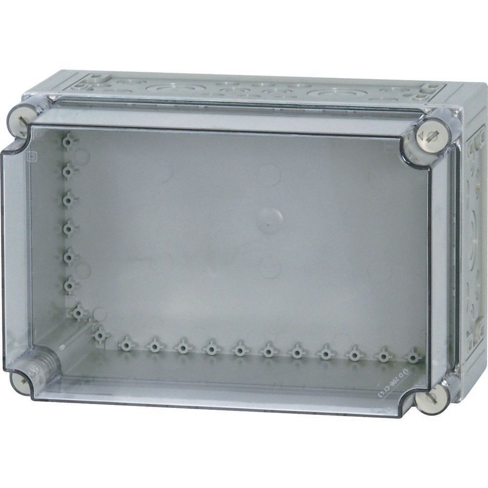 Einzel-Leergehäuse, Material: Polycarbonat, schlagfest, Schutzart IP65, patentierter Deckelverschluss mit integriertem Überdruckausgleich, mit metrischen Vorprägungen für Kabelführungen an allen Seiten, Leistungseinführungen oben und unten, jeweils = 2x M50/32, 6x M25/16 und 8x M20, jede Seite = 1x M50/32 und 6x M25/16, Befestigungsbänder zur Wandbefestigung, plombierbare Deckelverschlüsse, Seitenwände ausschlagbar, als Verteilergehäuse umbaubar durch Ausschlagen der Seitenwände., RAL 7035, Grau (Sockel), transparent rauchgrau, (Abdeckung), Einbautiefe bei Montageplatte=125mm, Abdeckungstyp: transparent rauchgrau