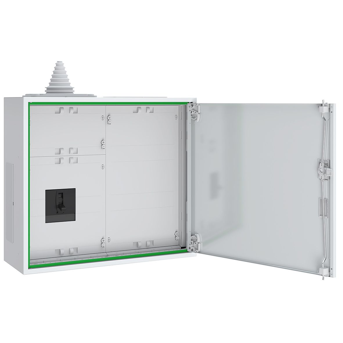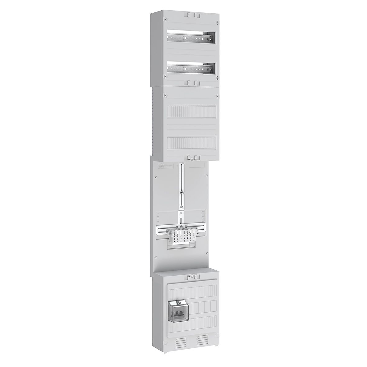 Systemgehäuse für AP-, UP- und teilversenkter Montage, bestehend aus: Leergehäuse mit flächenbündiger Leitungsmembran, seitlichen Vorprägungen für Querverdrahtung im AAR und Sammelschienenverbindung im NAR, Volltür mit Schubstangen, Abmessungen: 1050x1400x210 mm, Schutzklasse II (schutzisoliert), Schutzart IP54, Stahlblech pulverbeschichtet, 432 Teilungseinheiten,
