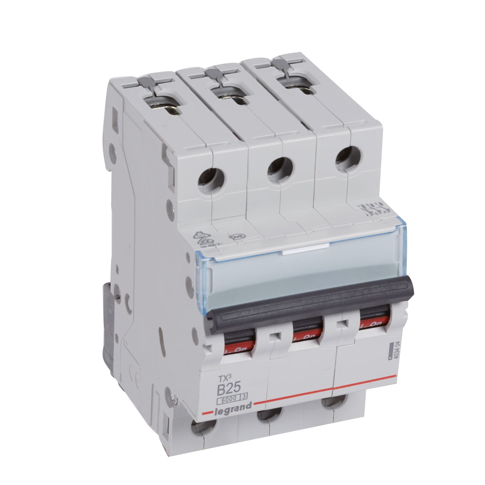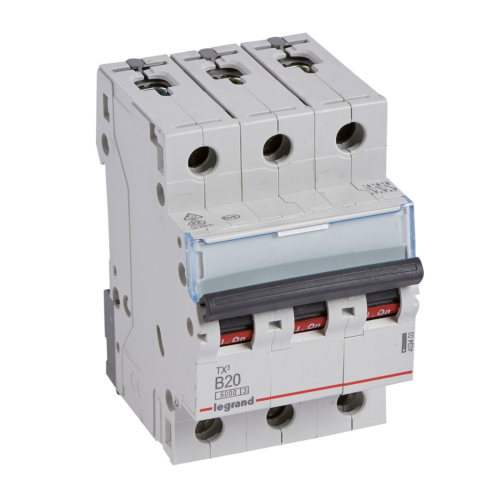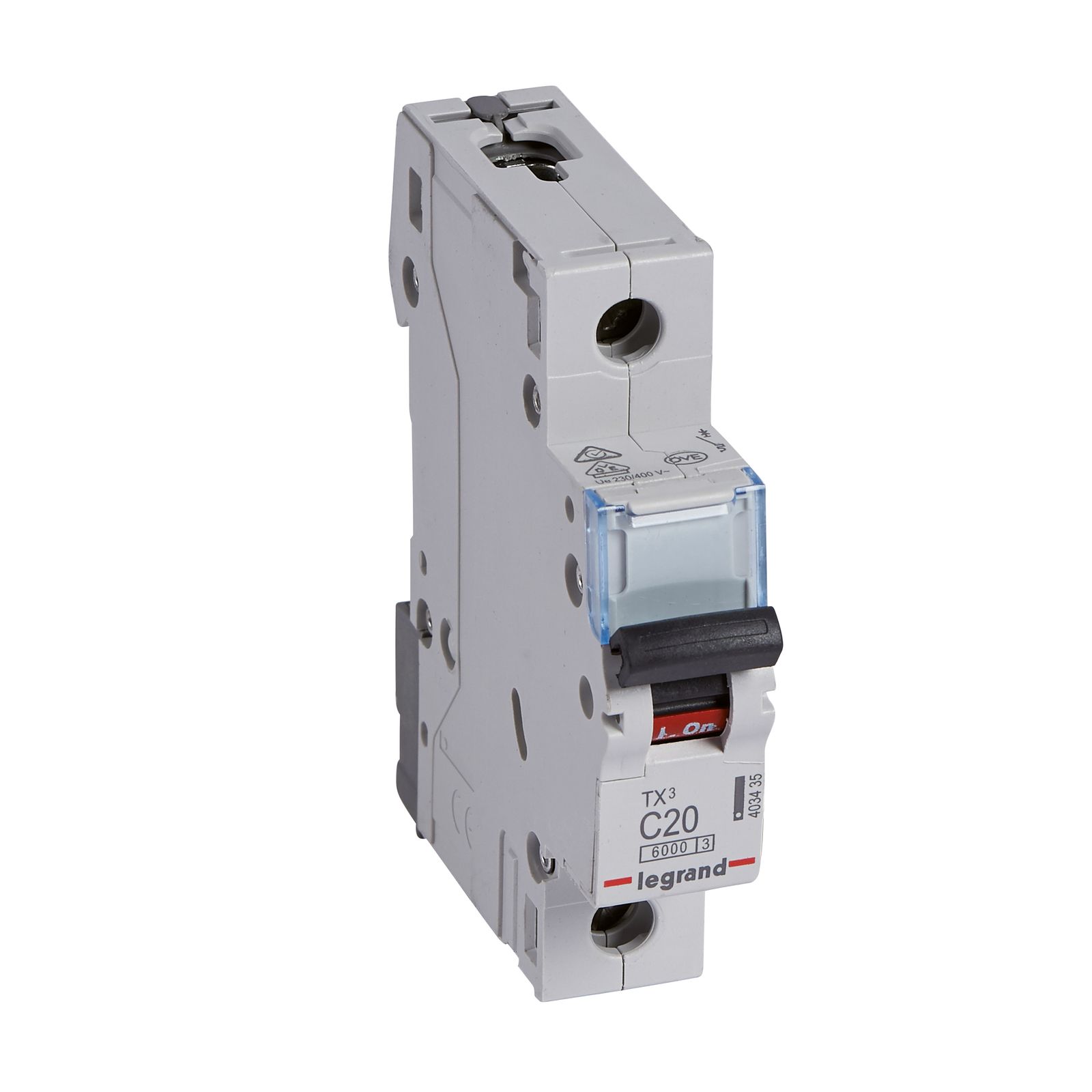 Legrand Leitungsschutzschalter TX3 nach EN 60898-1, VDE 0641-11, EN 60947-2, 1-polig, B-Charakteristik, Bemessungsstrom In 20 A, Bemessungsschaltvermögen Icn 6 kA nach EN 60898-1, Bemessungsspannung Un 230/400 VAC, Bemessungsfrequenz 50/60 Hz, Energiebegrenzungsklasse 3, Befestigung auf Hutprofilschiene EN 60715 durch eine rastende Schnellbefestigung, klare Information vorne auf jedem Gerät, eindeutige Schaltstellungsanzeige rot/grün am Schalthebel, mit Beschriftungsfenster, mit Untersteckschutz zum sicheren Einführen des Leiters in Fahrstuhlklemme, Anbau von Hilfsgeräten möglich. Leitungsschutzschalter mit B-Charakteristik sind vornehmlich für den Leitungsschutz in Licht- und Steckdosen-Stromkreisen bestimmt.