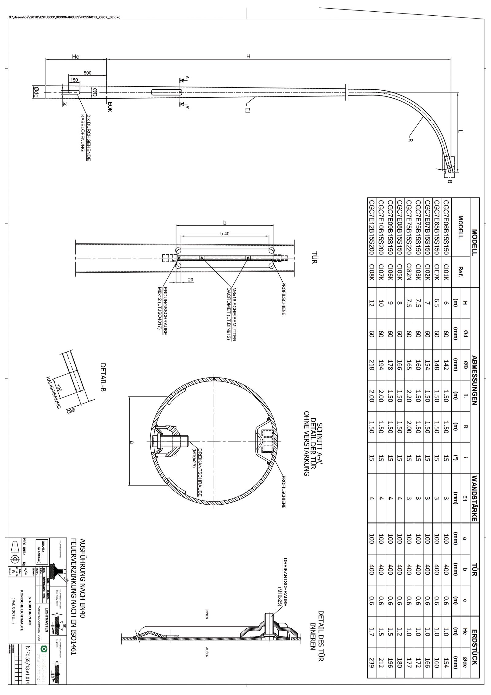 Auslegermast 8,0/1,5, CGC7E08B15S150, Erdstück, konisch-rund längsnahtgeschweißt Lichtpunkthöhe: 8,0 m, Erdstücklänge: 1,2 m, Ausleger kreisförmig gebogen, Biegeradius: 1500 mm, Ausladung: 1500 mm, Neigungswinkel: 15°, Zopfmaß: 60 x 100 in mm, Fußmaß: 180 mm, Wandstärke: 4,0 mm, Konizität: 12 mm/m, 2 Kabelöffnungen im Erdstück 50 x 150 mm,180° Tür: 100 x 400 mm, Türverschluß 3-kant 10mm-V2A C-Schiene mit 2 Schiebemuttern M6 (DIN 49778), 2x 6-kant Schrauben, inkl. Erdungsschraube M8x12, Ausführung gemäß DIN EN 40, erhöhte Stahlgüte S275 statt S235 gemäß DIN EN 10025, Feuerverzinkung gemäß DIN EN ISO 1461, Widerstand gegen horizontale Lasten: 25,0 m/s 0,38 m² - 20 kg, Geländekategorie: II, Verformungsklasse 3, Sicherheitsklasse: B, passive Sicherheit: Klasse 0 CE - Zertifikatnummer: 0099/CPR/A55/0066