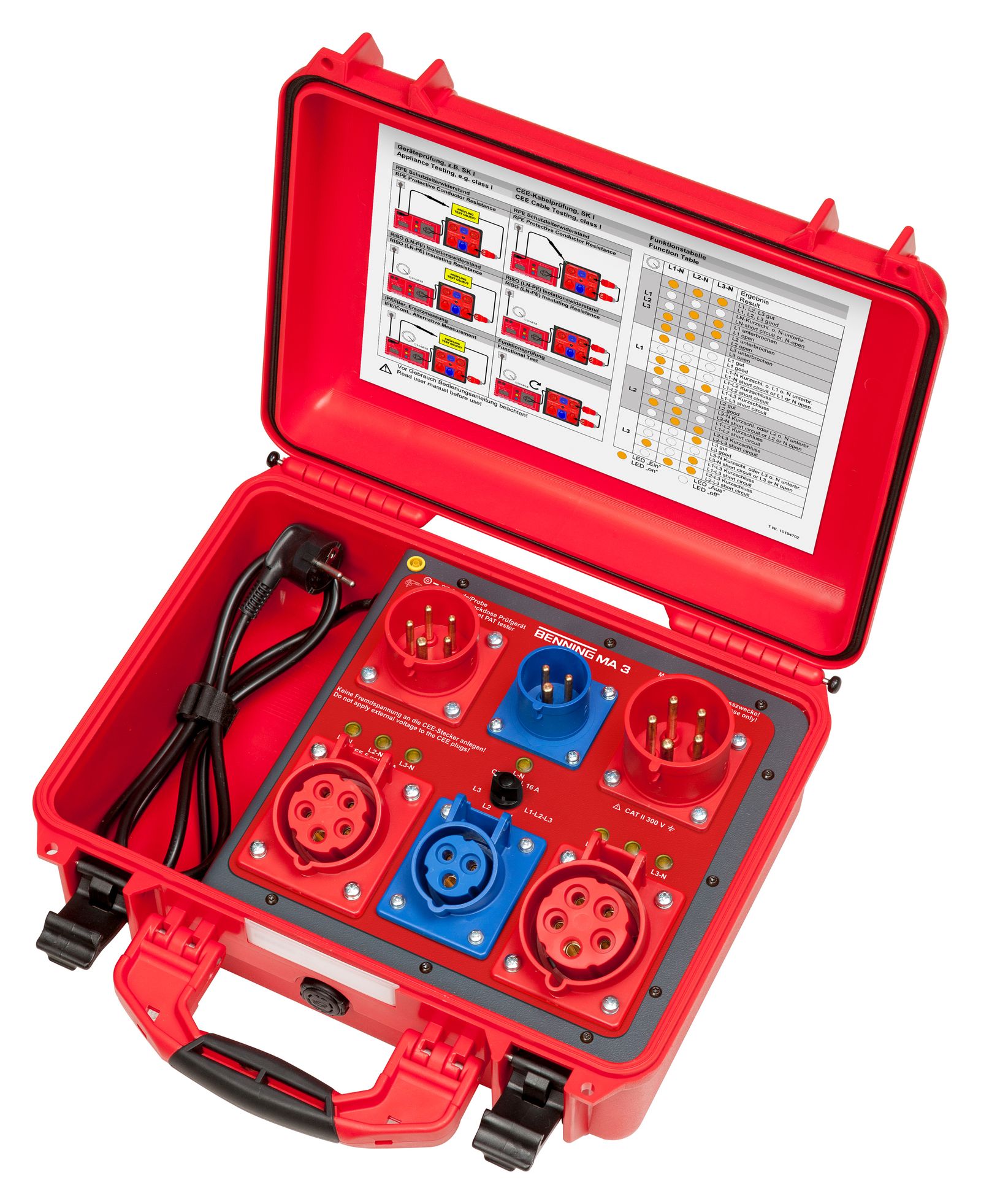 Benning MA 4 für die aktive und passive Prüfung von 1- und 3-phasigen Geräten (inkl. Schweißgeräte), sowie Verlängerungsleitungen. Anschluss für Prüflinge mit CEE 16 A/230 V, CEE 16 A/400 V und CEE 32 A/400 V Stecker. Messadapter kann mit 32 A voll belastet werden. Unterstütze Messungen: RPE Schutzleiterwiderstand, RISO Isolationswiderstand, IDiff. Differenzstrom, IEA Ersatzableitstrom, Auslösezeit und Auslösestrom von PRCDs. Betriebsmittel- und Kabel-Funktionsprüfung inkl. Leitungsbruch-, Kurzschluss- und Drehfeldprüfung. Eigentest: Bewusste Zuschaltung eines Gerätefehlerstroms (1 mA/ 3 mA) zur Prüfung des gesamten Testsystems. 7 Status-LEDs und 1 Netz-LED. Robuster und staub-/wasserdichter Schutzkoffer IP 67. Sicherung 16 A (749764).