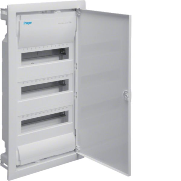 Erfahren Sie mehr über den 3-reihigen Multimedia-Unterputz-Kleinverteiler volta VU36NW von Hager, Schutzklasse IP30. Mit geschlitzter Stahlblechtür und DIN VDE 61439-3 Zertifizierung eignet er sich für den Einsatz in Wohngebäuden und den Einbau von schutzisolierten VDI-Komponenten. Mit Stahlblech-Geräteträger zur Aufnahme von einzeln isolierten Hutschienen. Der Kunststoff-Mauerkasten ist mit Leitungsabfang und ausbrechbarem Leitungseinführungsschieber ausgestattet. Das ist Hager!