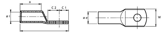 Presskabelschuh Cu, DIN 46235. Technische Daten - Werkstoff: Cu-ETP nach DIN EN 13600: Oberfläche: galvanisch verzinnt, andere Oberflächen auf Anfrage: besonders geeignet für feindrähtige Leiter nach IEC 228: Ausgeglüht auf Kupferhärte F 20. Ausführung: Querschnitt: 25 mm²: Bolzen-Ø: 6 mm: Kennziffer: 10: W: 14: Øi: 7: Øe: 10: C1: 8,5: C2: 10: a: 20,5: L: 47,5: Gewicht per 100 St.~kg: 1,67: Pressung 7 mm: 1: Pressung 5 mm: 2: nach DIN: x: VE/Stck. 50
