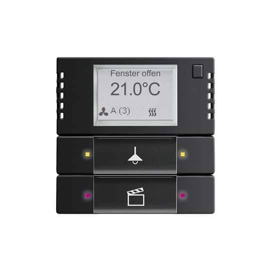 Für Busch-Installationsbus KNX Busankoppler 6120/12-101, 6120/13 und Busch-Powernet KNX Netzankopplung 6920/12, 6920/13. Mit Beschriftungsfeld. Unterstützung der KNX-Funktionen durch innovatives Farbkonzept (gelb=Beleuchtung, blau=Jalousie, orange=RTR, magenta=Szene und weiß=neutral/keine Funktionszuordnung) oder Standardbeleuchtung rot/grün. Tasterfunktion (Schalten/Dimmen/Jalousie/Wert senden/Lichtszenen/Lüftungsfunktion) Master-/Slavebetrieb. Mit Grundlastbetrieb. Der Regler ist ein stetiger Raumtemperaturregler für Ventilator-Konvektoren (Fan Coil) in 2- und 4-Rohr Anlagen und konventionellen Heiz- oder Kühlanlagen. Die Lüfterstufe kann manuell oder in den Automatikbetrieb geschaltet werden. Transparenter Beschriftungsbogen mit Standardsymbolen in der Lieferung enthalten. Klasse des Temperaturreglers: 1 Beitrag zur Raumheizungsenergieeffizienz: 1,0%. ETS-Programmierung nur ab ETS 3.0f Designlinie: Plattform 63, future linear, Busch-axcent , solo , carat Designlinie Variante: future , future linear, Busch-axcent , Busch-axcent pur