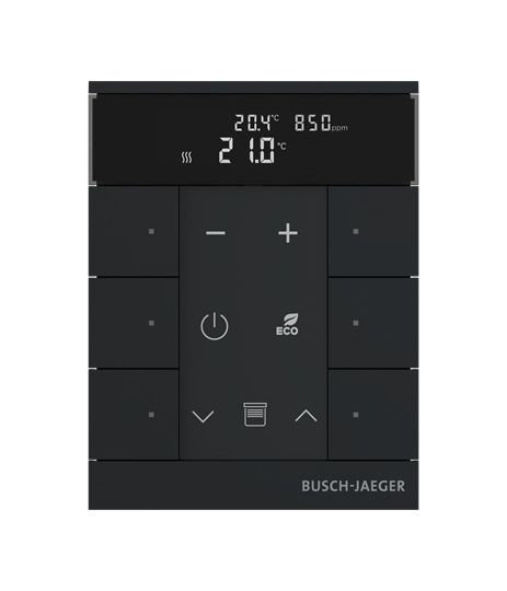 Busch-Tenton , Raumtemperaturregler mit CO2/Feuchte-Sensor und Bedienfunktion 6-fach Frei konfigurierbares Multifunktionsbedienelement. Mit integriertem free@home Busanschluss. Mit integriertem Raumtemperaturregler und Temperaturfühler. Tasterfunktion: Schalten / Dimmen / Jalousie /Wert senden / Lichtszenen u.a. Zur Ansteuerung von Heizungs-, Lüftungs- und FanCoil-Aktoren. Haupt-/Nebenstellenbetrieb Die Lüfterstufe kann manuell oder in den Automatikbetrieb geschaltet werden Spannungsversorgung über Bus-Klemmen (a,b). Tastkontakte links/rechts Designlinie: Busch-Tenton Produktreihe: Busch-free@home