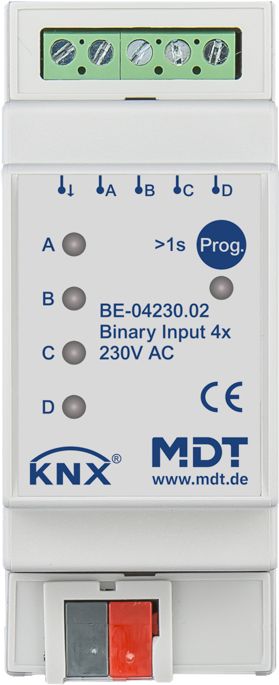 Schaltaktor 4fach 16A mit Handbetätigung für KNX Merkmale: Handbetätigung der Relais unabhängig vom Bus bzw. der Schaltstellungsanzeige. Schließer- oder Öffnerbetrieb. Zentrale Schaltfunktion. Sammelrückmeldung zur Reduzierung der Buslast. Aktive oder passive (Objekt auslesbar) zyklische Rückmeldefunktion. Rückmeldungen lassen sich nach Busspannungswiederkehr verzögern. Logische Verknüpfungsfunktion für jeden Ausgang. Sperrfunktion für jeden Kanal parametrierbar. Alternativ Zwangsstellungsfunktion für jeden Ausgang. Zeitfunktionen (Ein- bzw. Ausschaltverzögerung, Treppenlichtfunktion - auch mit Vorwarnfunktion). Einbeziehung in Lichtszenen möglich, max. acht interne Szenen je Kanal sind parametrierbar. Speicherfunktion für Lichtszenen. Betriebsstundenzähler als Vorwärts-/Rückwärtszähler mit Grenzwertfunktion (Grenzwert über Bus veränderbar) für jeden Ausgang aktivierbar. Eingangsüberwachung auf zyklische Aktualisierung mit Sicherheitsstellung. Reaktionen bei Busspannungsausfall und -wiederkehr und nach einem ETS-Programmiervorgang für jeden Kanal einstellbar. Unabhängiges Schalten der vier Ausgänge. Hinweise: Montage auf DIN-Hutschiene. VDE-Zulassung gemäß EN60669-1, EN60669-2-1. Lieferumfang: Anschluss- und Abzweigklemme für KNX im