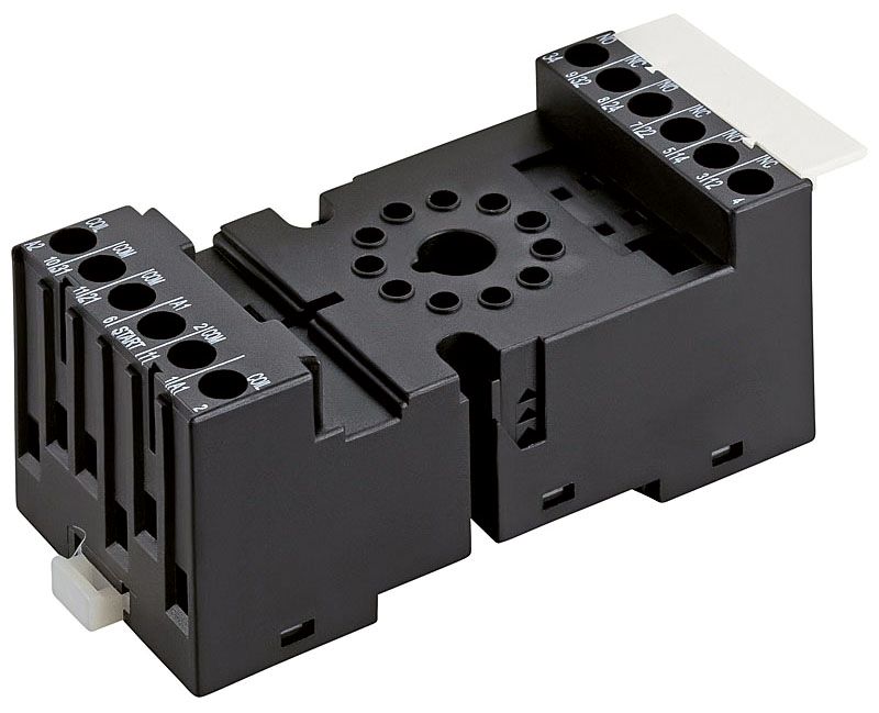 Industrie-Steckrelais 3 Wechsler für 10 A / 250 V AC. Kontaktmaterial AgNi, Spulendaten 24 V AC, 2,2 VA, 74 Ohm, blockierbare/tastende Handbetätigung und mechanische Anzeige Relaisschutzart: RT I