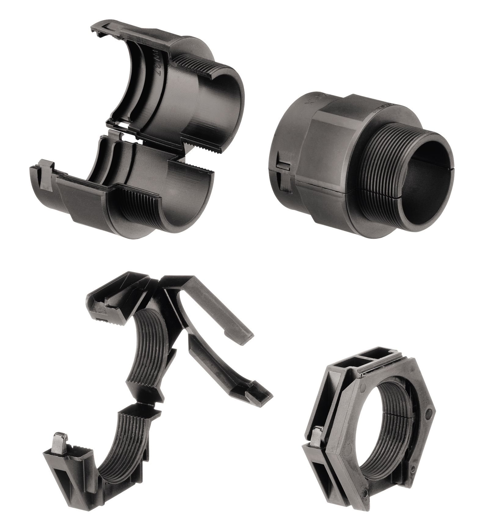 COV ist eine teilbare Verschraubung inklusive teilbarer Gegenmutter mit Pg-Gewinde aus Polyamid 6. Diese ist halogenfrei, nicht flammenausbreitend und in Farbe schwarz erhältlich. Verwendet wird diese teilbare Verschraubung zusammen mit der teilbaren Mutter speziell zum Anschluss von Co-flex Rohren an Verteiler und Geräte. Die Vorteile liegen in der Teilbarkeit von Verschraubung und Mutter. Schutzart IP43 nach DIN EN 60529 Temperaturbeständigkeit nach LV312-3: -40° C bis +120° C, kurzzeitig bis +140° C. Entflammbarkeit: UL 94 HB. DIN EN 61386-23 (VDE 0605-23)
