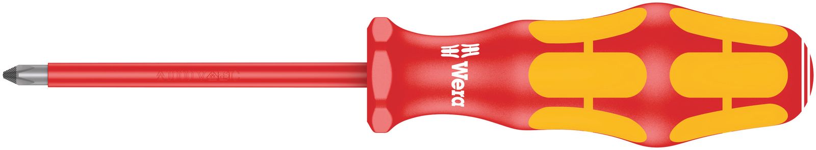1.000 V VDE-Kreuzschlitz-Schraubendreher PH0, isoliert, nach IEC 60900. Klassifikation VDE 0682, Teil 201. DIN ISO 8764. Stückgeprüft im Wasserbad mit einer Prüfspannung von 10.000 Volt. Ausführung: PH1x80 mm, Größe: 165 mm