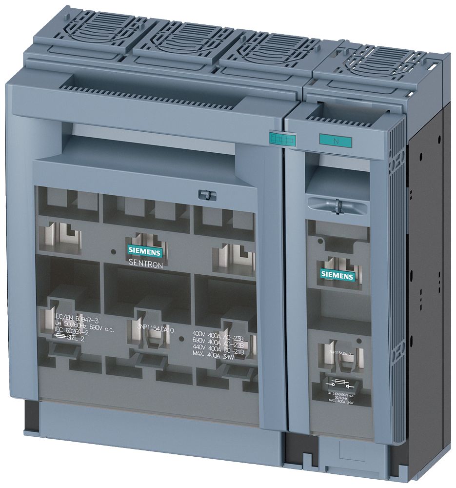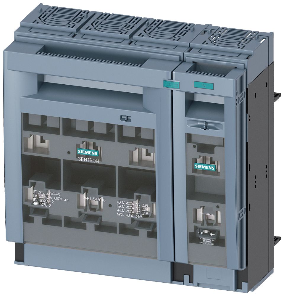 SENTRON, Sicherungslasttrennschalter 3NP1, 1-polig, NH2, 400 A, für Aufbau und Einbau auf Montageplatte, Flachanschluss, Abdeckebene 70mm Sicherungslasttrennschalter SENTRON 3NP1 zum Schutz von Anlagen in Industrie oder Infrastruktur vor Überlast und Kurzschluss. Die Sicherungslasttrennschalter besitzen eine elektronische Sicherungsüberwachungsfunktion, die eine optionale Netzüberwachung ermöglichen. Es sind flexible Schaltzeitpunkte des Hilfsschalters möglich. Der standardmäßig enthaltene Umgreif- und Berührungsschutz der SENTRON Reihe 3NP1 verhindert, selbst bei rückseitigem Zugriff, dass der Anwender bei der Montage auf Sammelschienensystemen stromführende Teile berührt. Die Sicherungslasttrennschalter 3NP1 sind erhältlich in 1-, 3- und 4-poliger Ausführung für Ströme von 125 A bis 630 A bis Schutzart IP40. Optimale Technik
