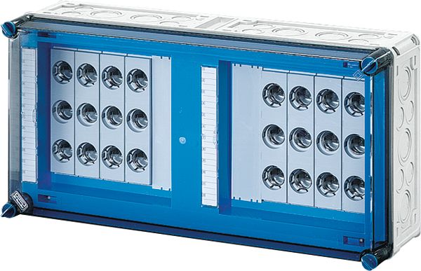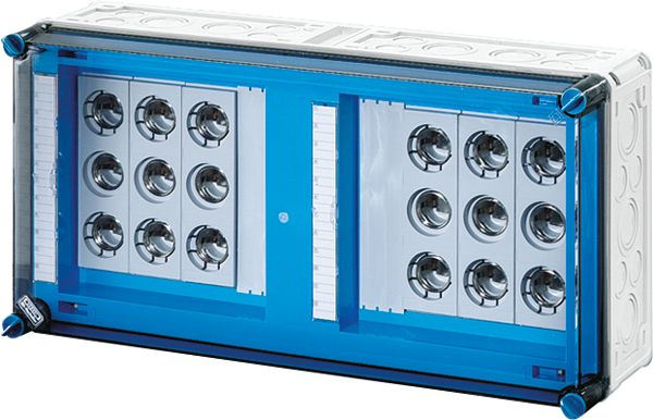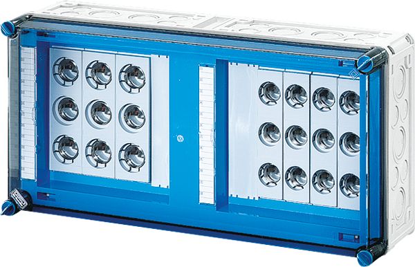 Gehäuse für den Bau von Energie-Schaltgerätekombinationen bis 630 A oder als Einzelgehäuse. Aus hochwertigem Polycarbonat schutzisoliert. Wanddurchführungen mit großen Öffnungen für die elektrische Verbindung der Gehäuse untereinander. Kabeleinführung an allen Gehäusewänden über metrische Vorprägungen oder Anbauflansche. Gehäuse zur Wandbefestigung auch über Außenlaschen oder mit Montageschienen. Gehäuse mit Sicherungselementen für D02-Sicherungseinsätze, E 18, auf Sammelschienen. Mit Zuleitungsklemmen, PE- und N-Klemmen und Berührungsschutz. Deckelverschlüsse für Handbetätigung.