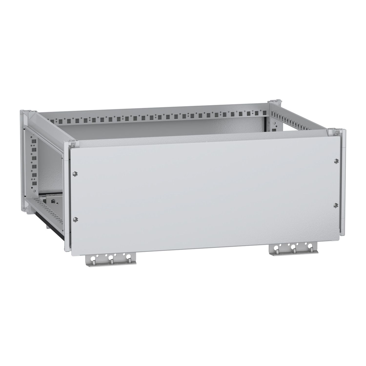 Dieses PanelSeT SFN ist ein Standgehäuse aus dekarbonisiertem Stahl, das für Mehrzweckanwendungen geeignet ist. Es enthält recycelten Stahl, der mit erneuerbarer Energie hergestellt wird, was zu einer erheblichen Reduzierung der CO2-Emissionen führt. Es hat eine Nennhöhe, -breite und -tiefe von 2000 mm, 800 mm bzw. 600mm. Der Rahmen und die Stützen des Gehäuses sind aus verzinktem Stahl gefertigt, um eine lange Lebensdauer zu gewährleisten. Die Tür und die Paneele sind aus Stahlblech gefertigt, während der Griff aus Polyamid 6 mit 30 % Glasfasern besteht. Eine Epoxid-Polyester-Pulverbeschichtung sorgt für ein ebenmäßiges Aussehen. Das Gehäuse hat eine graue (RAL 7035) Farbe mit einem schwarzen (RAL 9005) Griff. Eine Einfache Tür, eine Rückwand, ein Dach, zwei Gleitschienen und ein Bausatz Schnellbefestigungshalterungen. Die Tür hat einen Öffnungswinkel von bis zu 120 Grad und ist reversibel, das heißt, sie kann von beiden Seiten geöffnet werden. Die Tür ist mit einem Vier-Punkt-Schloss und einem Griff mit 5-mm-Doppelbart versehen, der für Sicherheit sorgt. Das Gehäuse hat die Schutzart IP55, d.h. es ist resistent gegen das Eindringen von Staub, Wasser und Öl. Das Gehäuse ist außerdem stoßfest und hat eine IK10-Einstufung. Die Bedienung ist durch den Zugang von hinten, vorne und von der