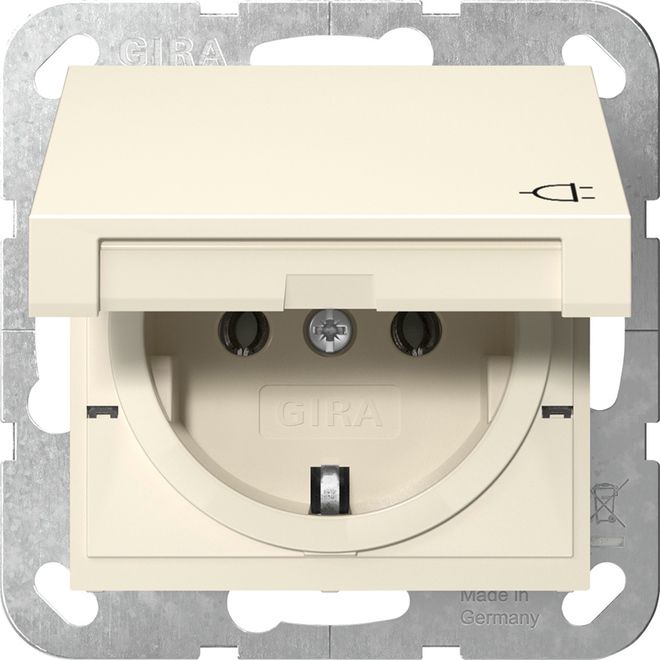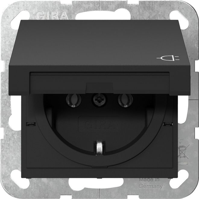 SCHUKO-Steckdose 16A 250V~ mit KlappdeckelAnthrazit System55 Merkmale: Tragring ist in Verbindung mit den Befestigungskrallen und Krallenschrauben geerdet. Schnellbefestigung (ca. 3,5 Umdrehungen pro Befestigungskralle). Eingehauste Spreizkrallen. Einfachere Krallenbefestigung durch robusten Schraubenkopfantrieb PZ1 / Schlitz / PH. Vereinfachte Installation durch patentierte Anordnung der großen Schlüssellochprofile mittels Dosenschrauben. Geringe Einbautiefe. Große, ergonomisch geformte Lösehebel. Stabiler Erdungsbügel mit massiven Erdungsfingern. Stabiler und korrosionsbeständiger Stahltragring. Bruchsicherer Thermoplastsockel. Hinweise: Abdeckrahmen (1- bis 5fach) aus den Schalterprogrammen Standard55, Gira E1 und Gira E2 in Verbindung mit dem Dichtungsset auch für die Montage von Unterputz-SCHUKO-Steckdosen mit Klappdeckel wassergeschützt IP44 geeignet. Lieferumfang: