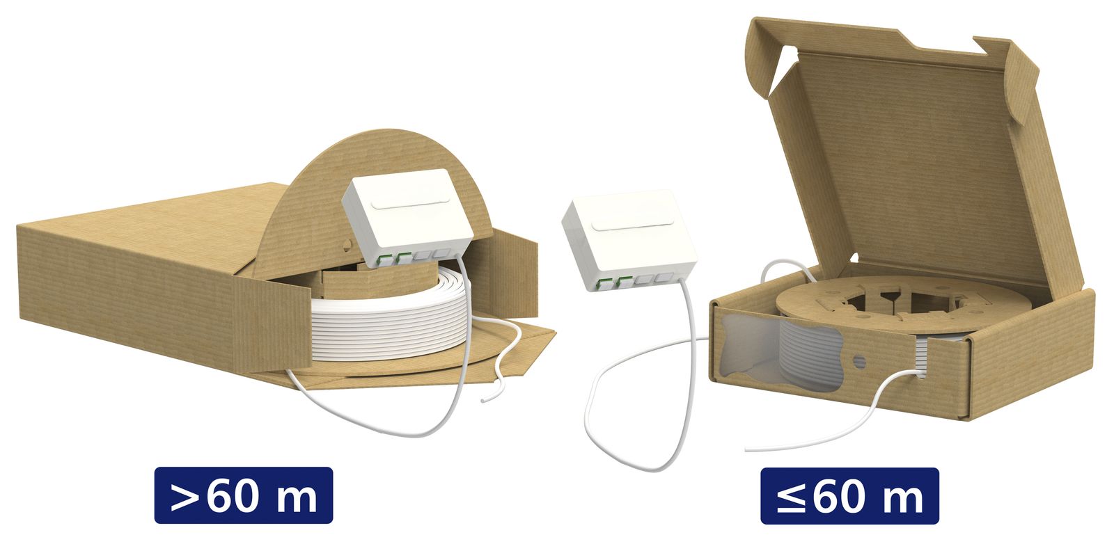 Kompakte Glasfaser-Anschlusseinheit zur Aufputz-Montage an Unterputz- oder Hohlwanddosen, Dose montagefertig vorkonfektioniert mit Singlemode-Innenkabel und bestückt mit Kupplungen inkl. Laserschutz für den Anschluss von bis zu vier Glasfaser-Patchkabel.Zweite Seite des Kabels offen zum Einschieben, Einziehen oder Einblasen in Leerrohre. Geeignet zum Spleißen oder für die Montage von feldkonfektionierbaren LWL-Steckern (OpDAT FAST Hybrid).Kabel montagefreundlich auf Karton-Trommel aufgespult , Schnelles und einfaches Abrollen des Kabels ohne Entnahme der Kabeltrommel aus dem Umkarton bei Kabellängen von 10 - 60 m, Zwei Kabeltypen verfügbar:, Mini-Breakoutkabel Compact, weiss, Ø 4,5 mm, FITH-Kabel, weiss, Ø 2,3 mm, Singlemodefaser OS2, E9/125 µm, biegeunempfindlich gemäß ITU-T G.657.A, kompatibel zu G.652.D, Befestigungsmaterial im Lieferumfang enthalten, Farbe Dose reinweiß (ähnlich RAL 9010), Kabellängen: 5 bis 100 m in 5 m-Schritten, (XX in der Artikelnummer durch die Länge ersetzen, z.B. 05=5 m, A0=100 m), alle verfügbaren Varianten können über den VADT-Konfigurator
