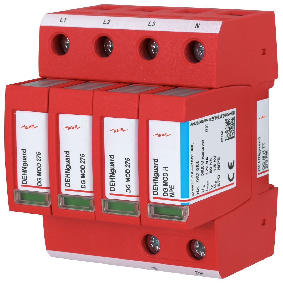 Mehrpoliger Überspannungsableiter DEHNguard M, Typ 2 nach EN 61643-11, bestehend aus Basisteil und gesteckten Schutzmodulen. Hohe Gerätesicherheit durch Ableiterüberwachung mit Thermo-Dynamik-Control. Zum Schutz von Niederspannungs-Verbraucheranlagen vor Überspannungen. Zum Einsatz im Blitz-Schutzzonen-Konzept an den Schnittstellen 0B 1 und höher.