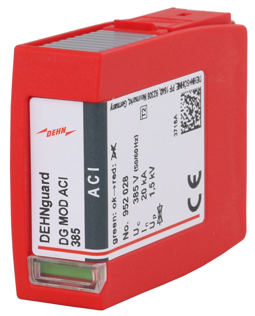 Mehrpoliger Überspannungsableiter DEHNguard MP ACI, Typ 2 nach EN 61643-11 mit integrierte ACI-Schalter-/Funkenstrecken - Kombination, bestehend aus Basisteil mit gesteckten Schutzmodulen und Doppel-Push-In-Anschlussklemme für Stich- und Durchgangsverdrahtung geeignet. Hohe Gerätesicherheit durch Ableiterüberwachung mit Thermo-Dynamik-Control. Zum Schutz von Niederspannungs-Verbraucheranlagen vor Überspannungen. Zum Einsatz im Blitz-Schutzzonen-Konzept an den Schnittstellen 0B 1 und höher.
