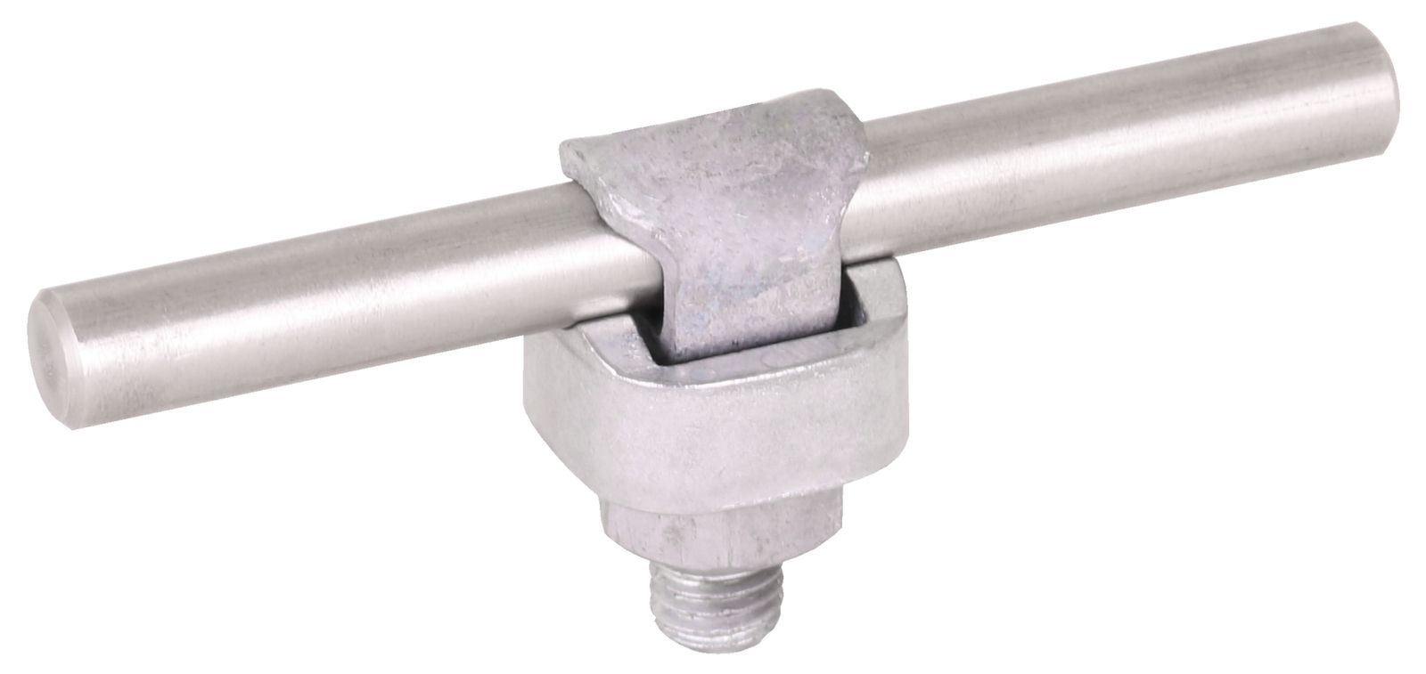 KlemmSchrauben-Verbinder nach DIN EN 62561-1, zum blitzstromtragfähigem Anschluss von Rundleitern z. B. an Flachprofile, Regenrohrschellen oder andere Teile der Blitzschutzanlage. Ausführung einteilig VA-St mit Schraube, Federring und Mutter M10.