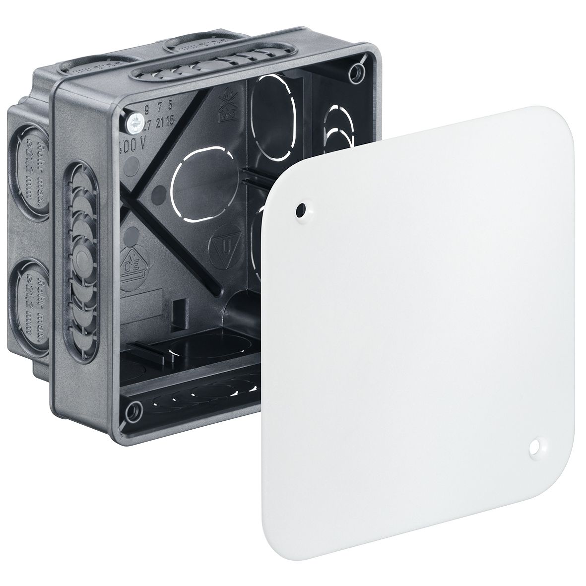 Verbindungskasten mit Deckel, 107 x 107 x 57 mm (1095-91). Unterputz-Verbindungskästen in allen Größen und für fast alle Aufgaben. Dieses Programm zeichnet sich durch seine praxisnahen Gehäusegrößen sowie die baustellengerechte, robuste Bauart der Gehäuse aus. Installationsart: Basis-Installation | Anwendungsgebiet: Für Leitungsverbindungen | Länge: 107 mm | Breite: 107 mm | Tiefe: 57 mm